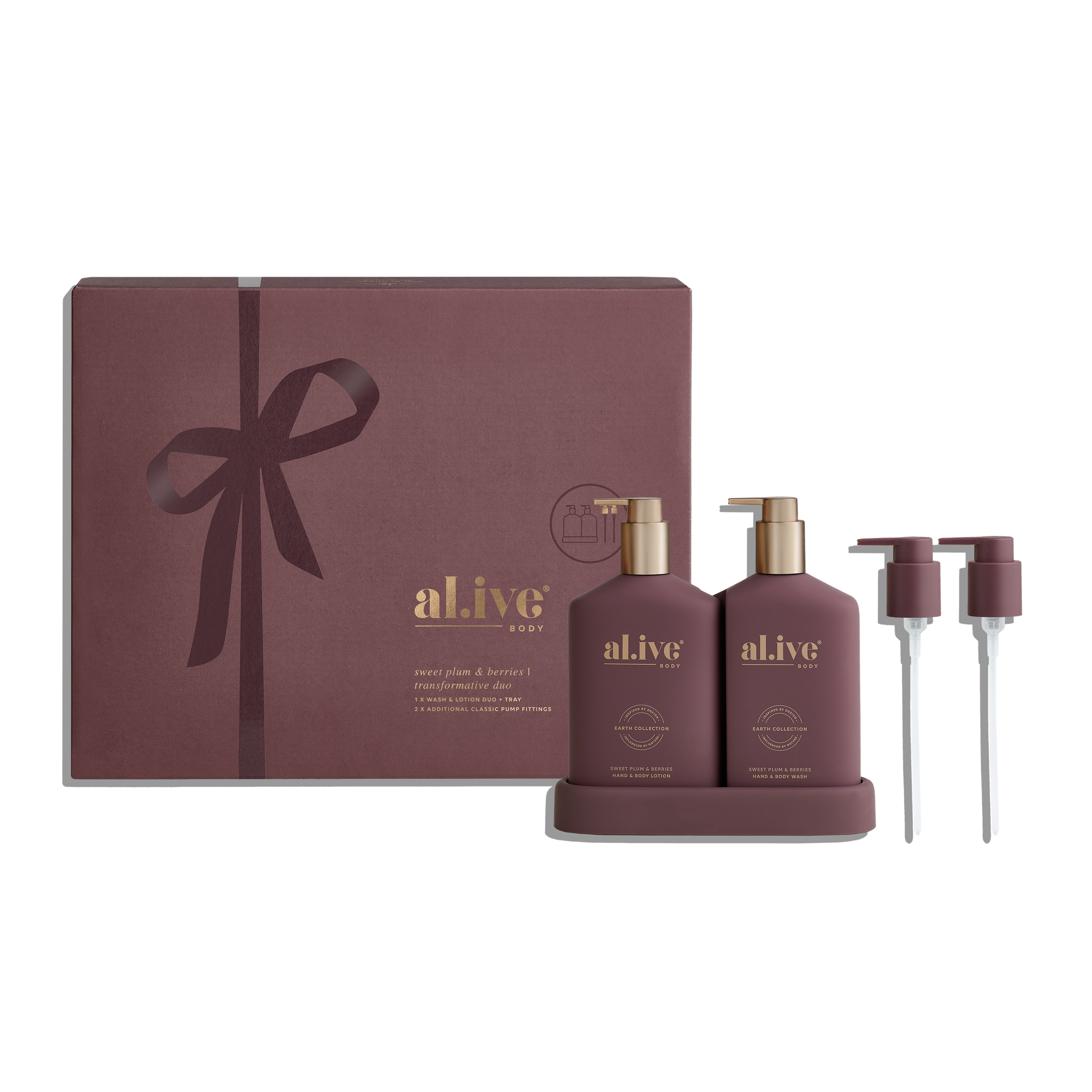al.ive body exclusive Sweet Plum & Berries scent featuring native Davidson Plum in signature interlocking bottles with Limited Edition mulberry colourway. Rich in Australian botanicals and antioxidants, this luxurious duo transforms daily care into moments of festive indulgence.
