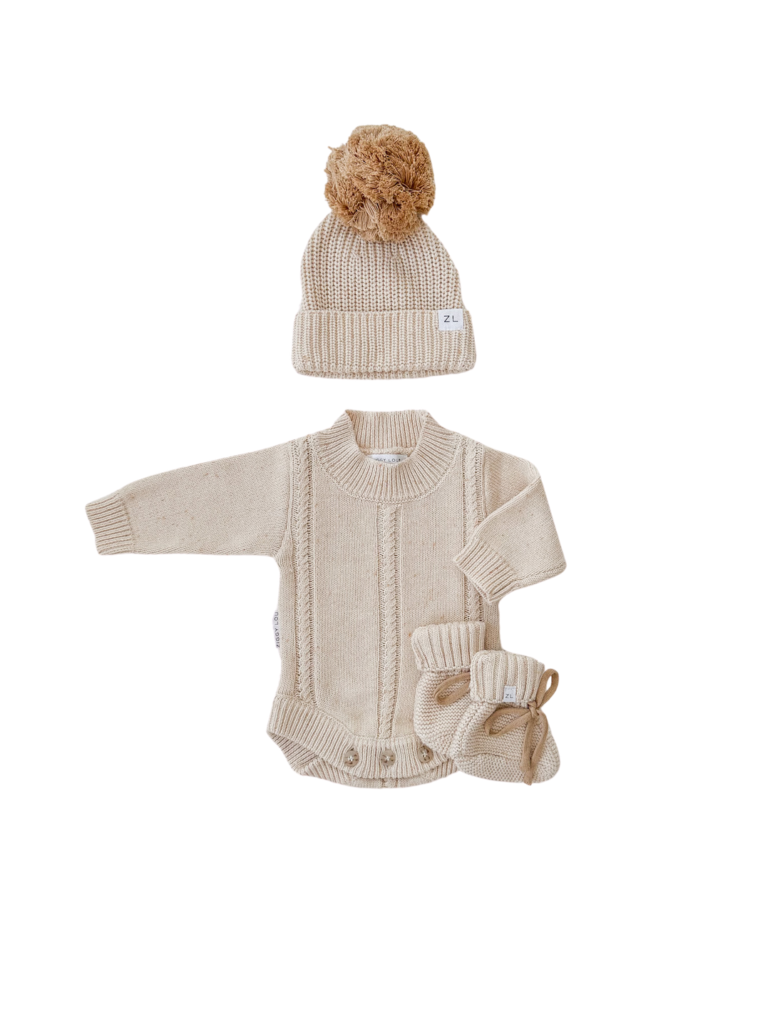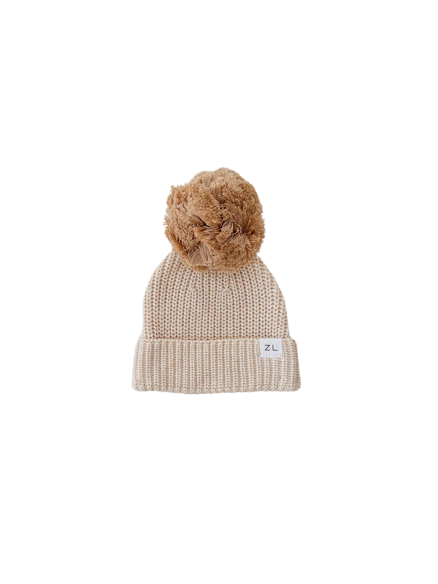 Our original chunky knit beanie in Biscotti Fleck with a Maple coloured pom pom. Pair with any of our Biscotti Fleck Signatures Collection.