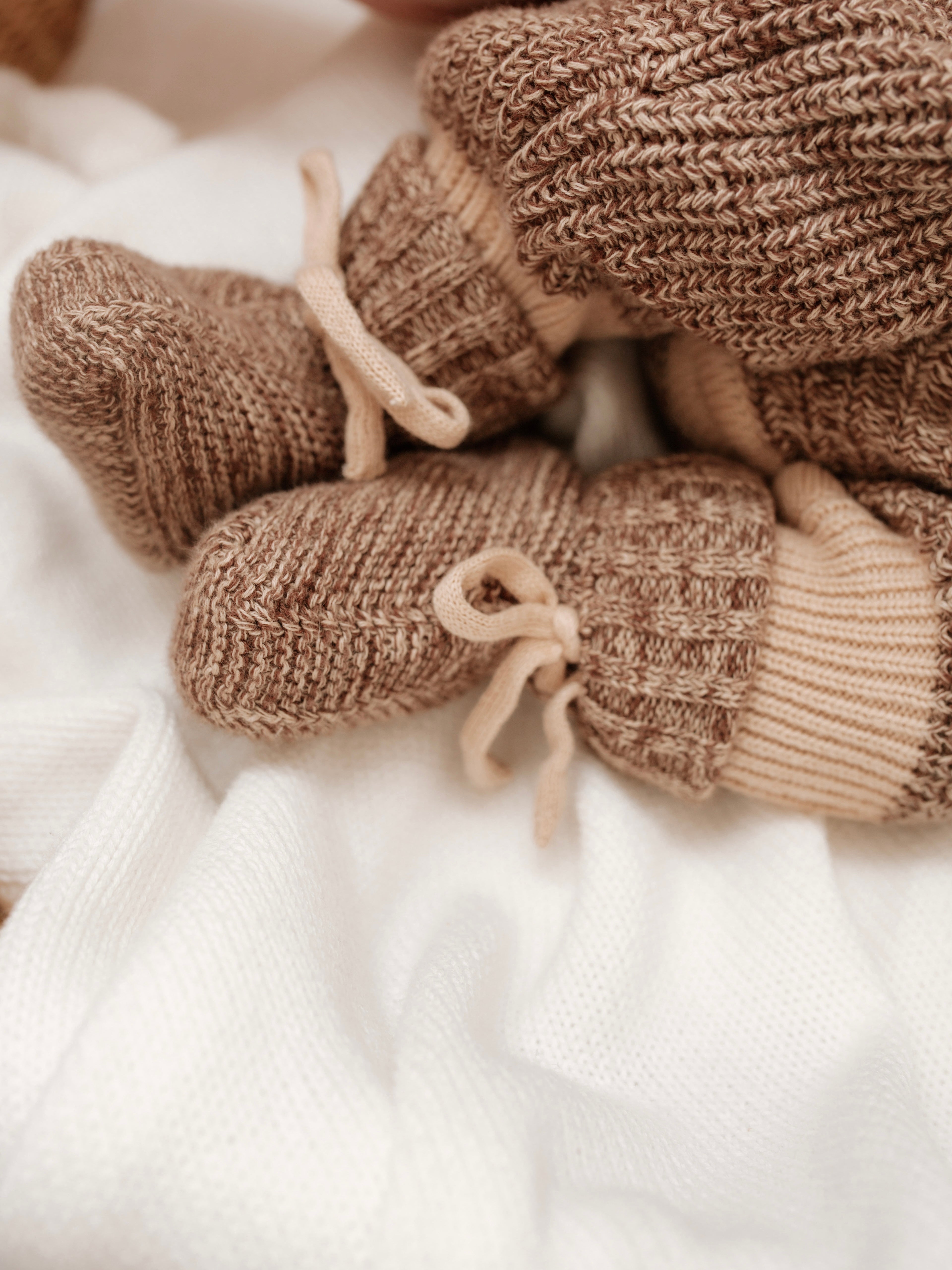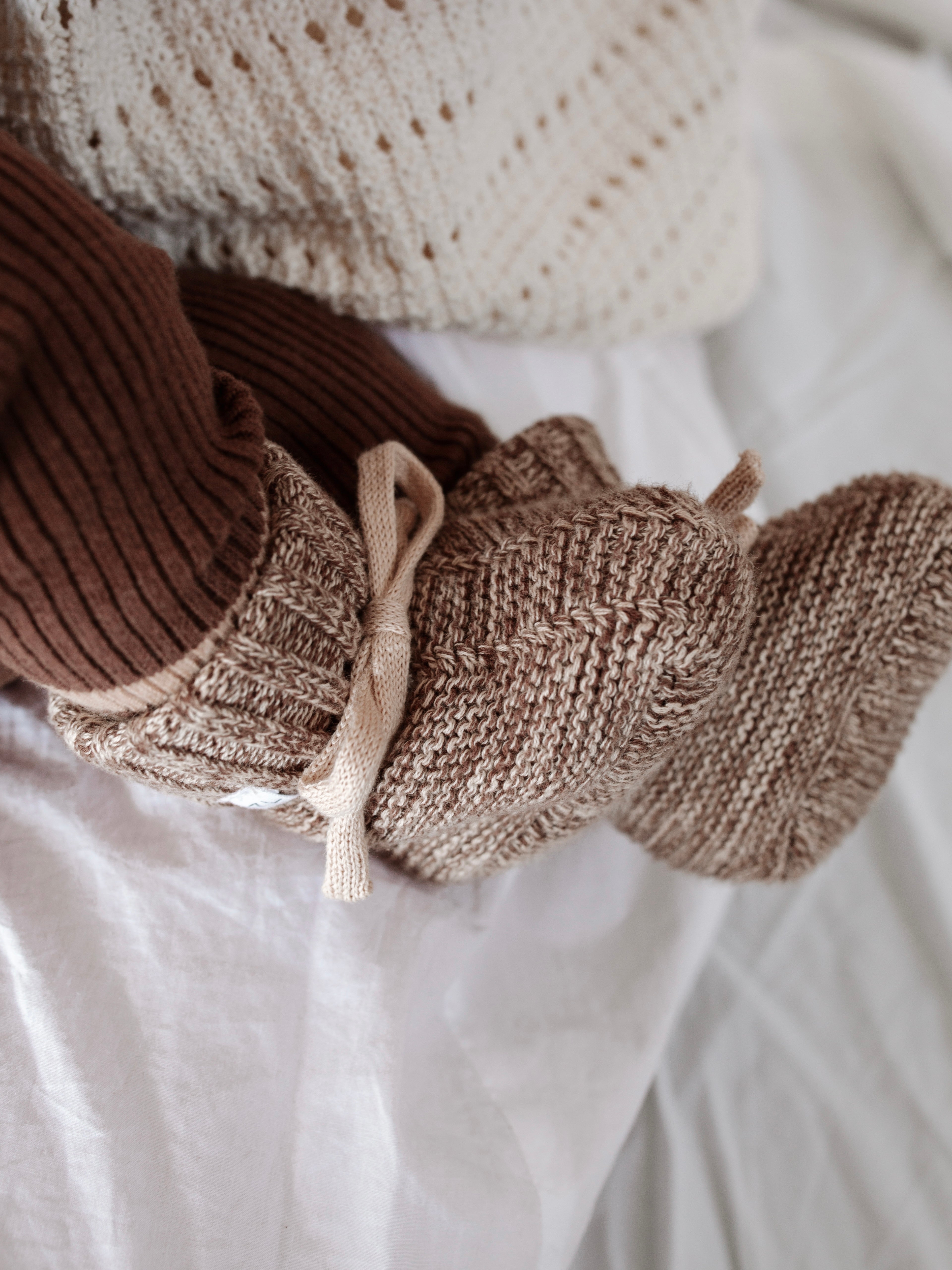 Knitted booties to compliment our Cedar + Theo Easter Collection. Functional drawstring to ensure booties don't fall off when worn. Matching Easter Bonnet + Beanie also available.