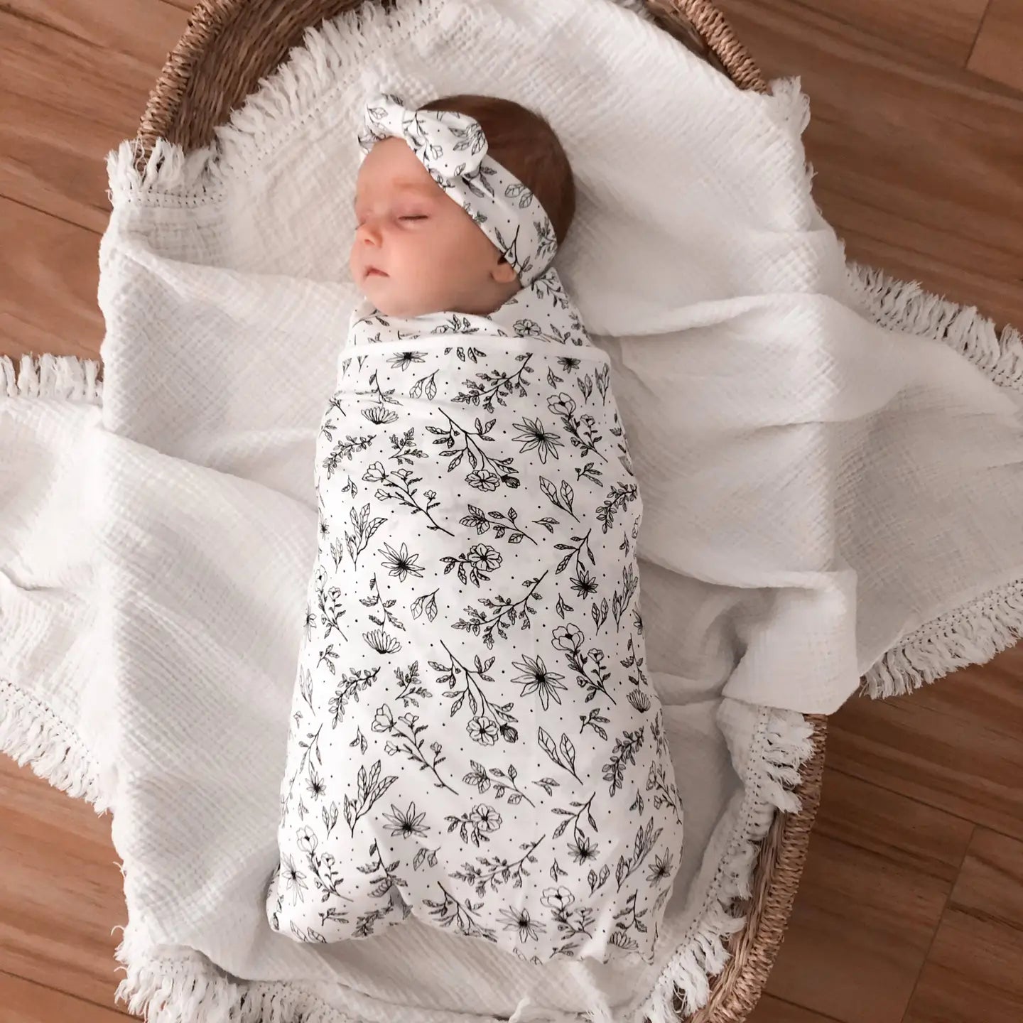 Our 100% Jersey Cotton Swaddle sets are GOTS certified & are so large, soft & stretchy the perfect combination to swaddle your baby so they are nice and snug. This set comes with a beanie & matching headwrap for your new baby. The Jersey material is perfect all year round & measures at a very large 120x120 meaning as your baby grows you'll be able to use it as a light weight breathable blanket for the cot/bassinet or cover for the pram/breastfeeding Material: 100% Jersey Organic Cotton (GOTS Certified) Washing instructions: Gentle Cold machine wash. Do not tumble dry. Different monitors, mobile devices & electronic devices may show varied colours. Please keep in mind colours may vary slightly. Please note: Swaddles must only be used by adults for their babies or under adult supervision. Ensure beanies and headwraps are removed prior to sleeping.