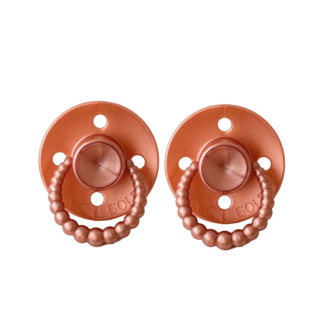 The newest dummies to hit the market are here! Designed & manufactured right here in Melbourne, Australia. Cmc gold dummies are an Australian owned brand & has been a two & a half year process from the first designs to testing to manufacturing. We can ensure that the dummies have been designed to not only look aesthetically pleasing but they've been engineered to be safe, practical & cater for all ages. What is a vented teat?  A vented teat is a teat that will allow the air to flow in and out. As the baby sucks on the dummy the teat will flatten in their mouths. Most dummies on the market have vented teats including: bibs, frigg, avent, nuk etc. Should water flow through your teat after steralising your dummy please follow instructions on your box & make sure you squeeze excess water out of your dummies before you give them to bub.Size 1 is perfect for newborn to six months. Size 2 - perfect for 6m+ size 3- 18.m+.