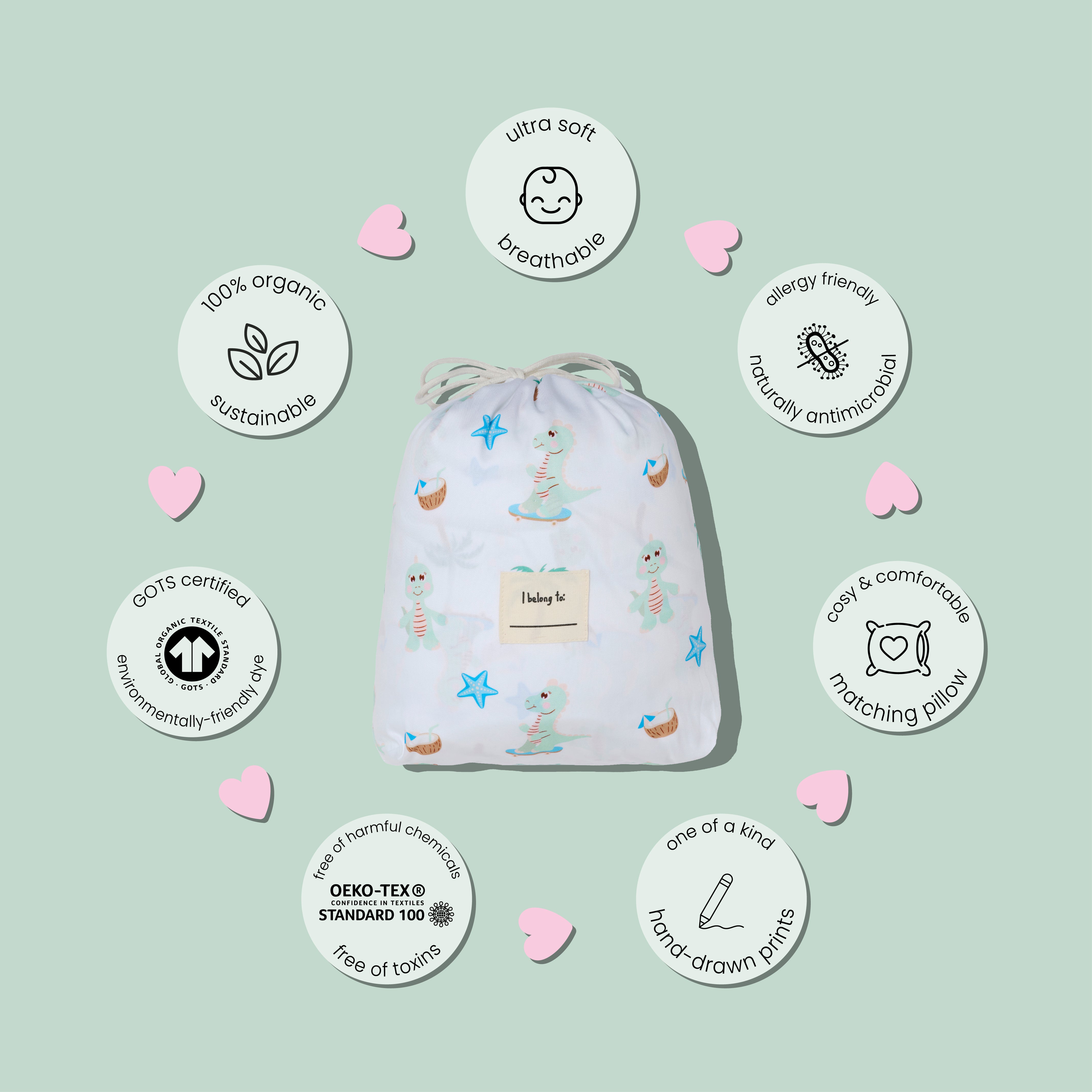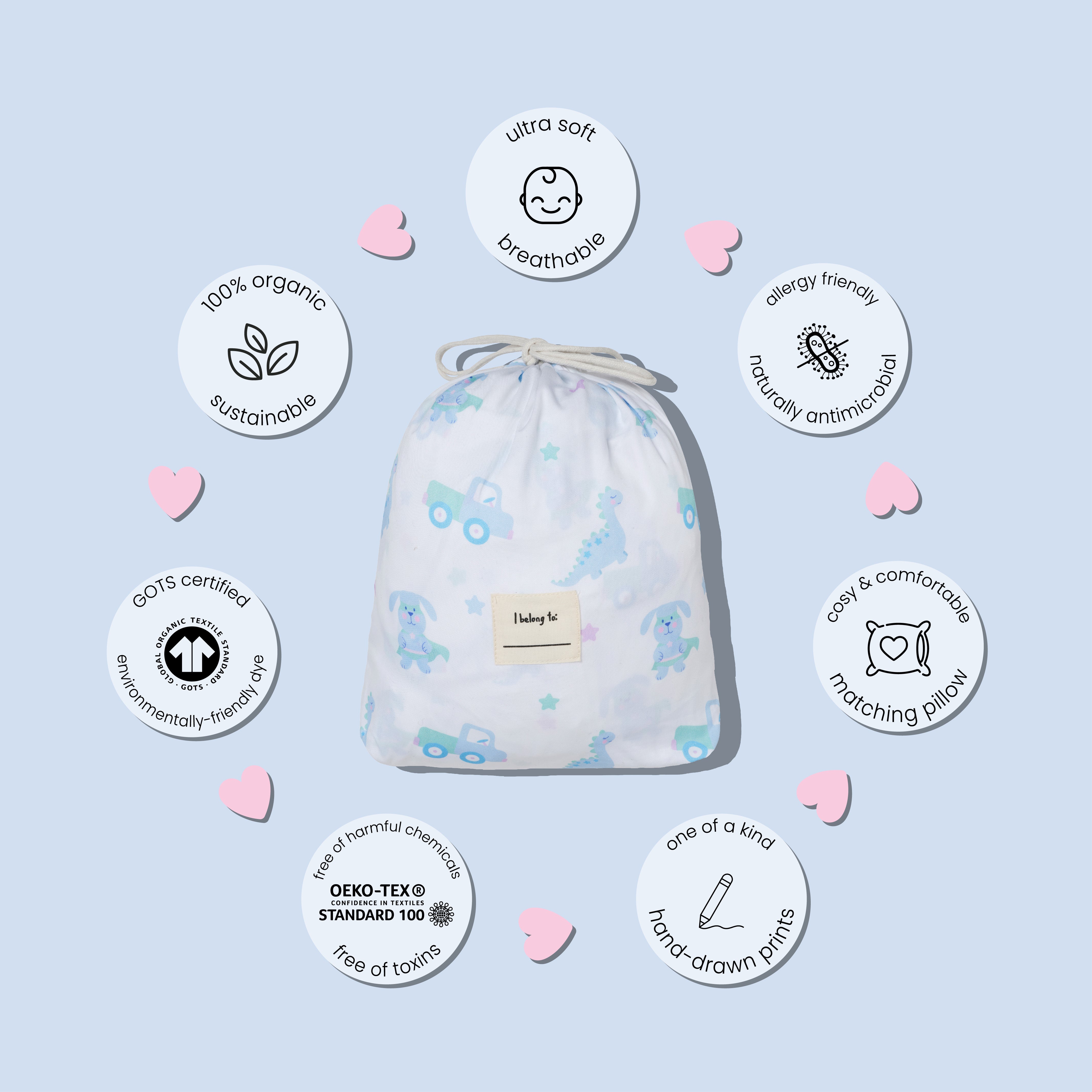 Each print is drawn by hand by our in-house illustrator who aims to spark joy and engage your child's imagination - they'll feel safe, happy and loved sleeping in these daycare sheets.