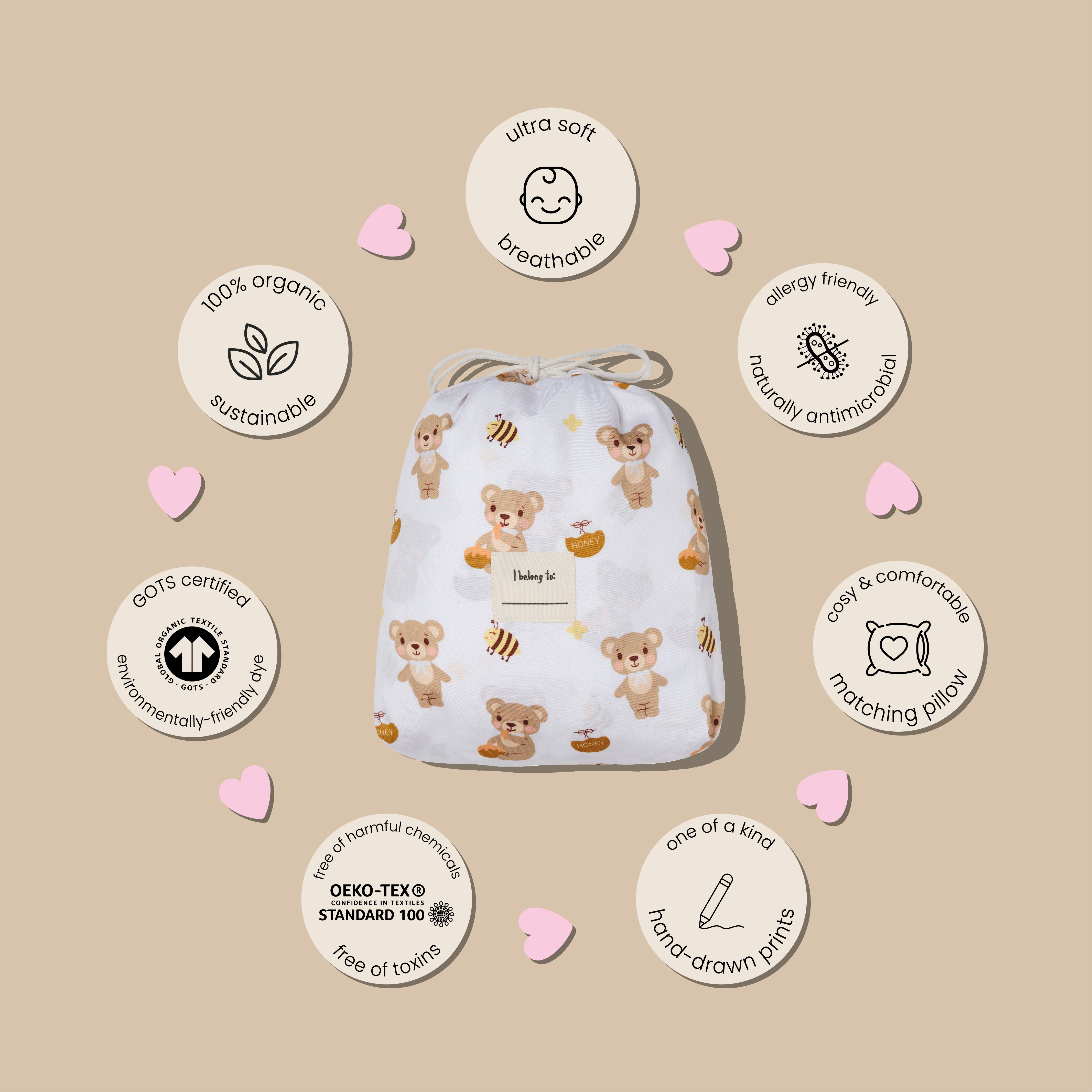 - Our cosy Honey Bear print will ensure your little one is tucked into the sweetest of sheets, featuring buzzing bees, bears and honey pots.