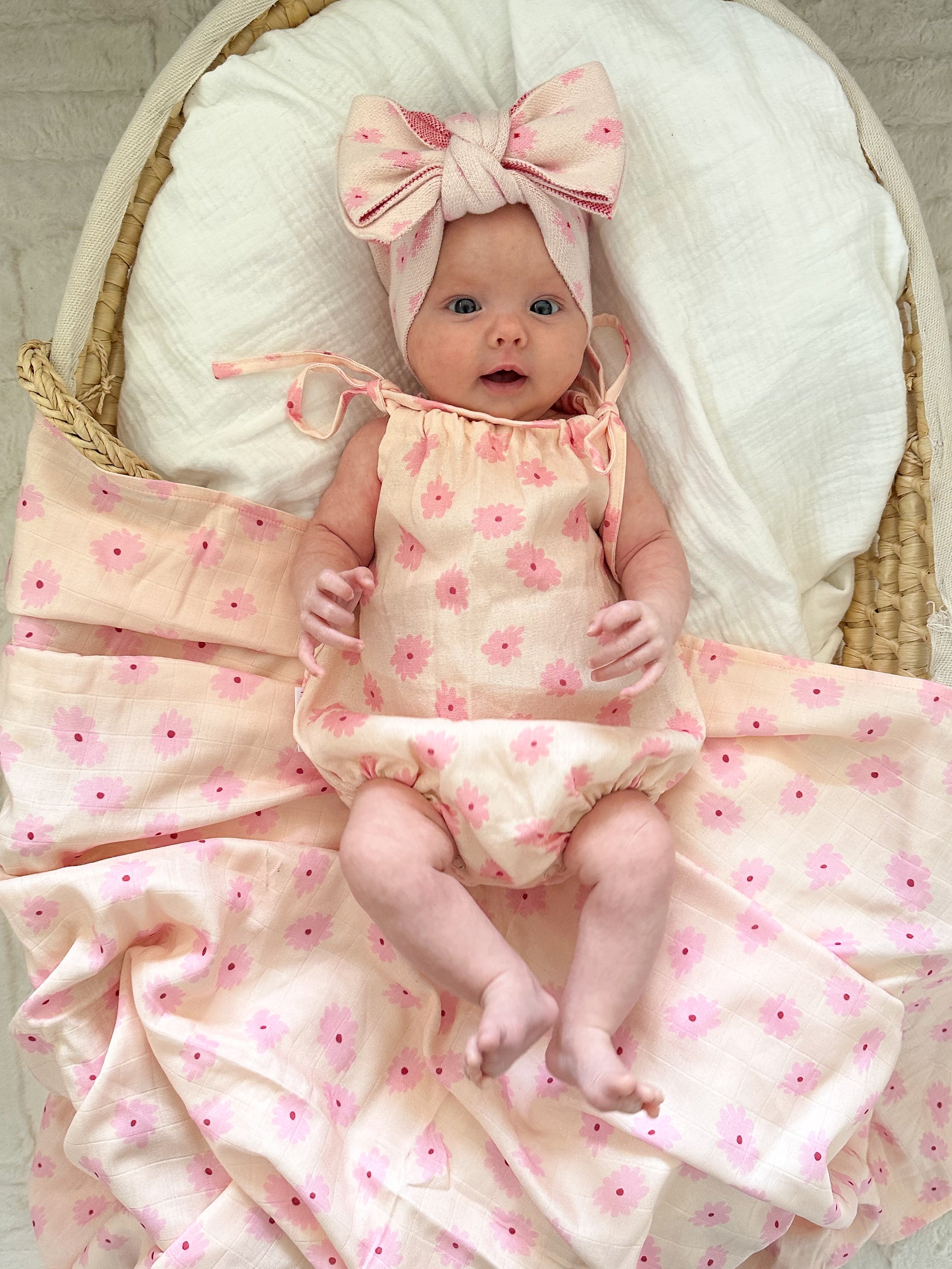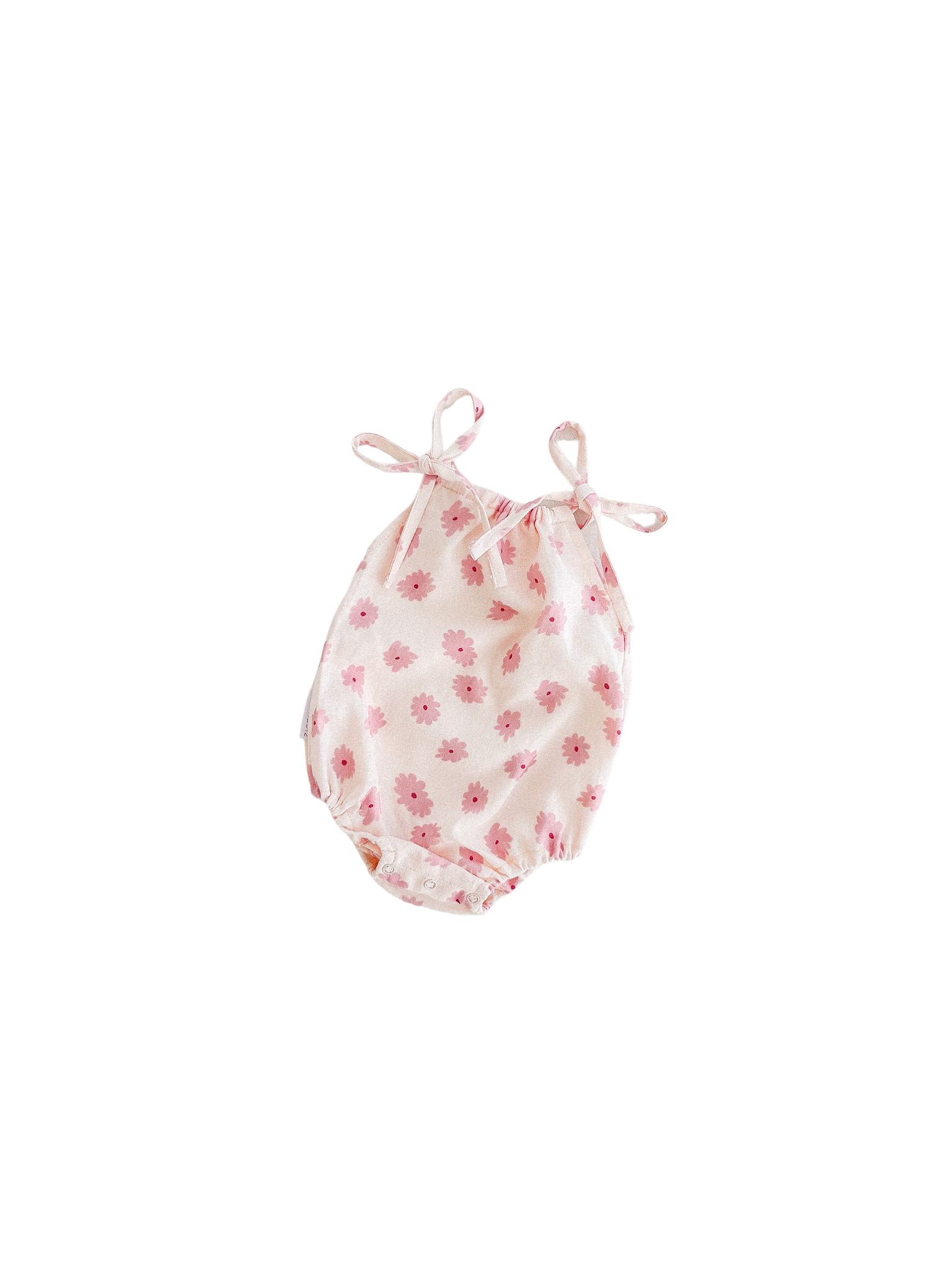 A lightweight linen blend romper featuring our Margot printed design. Functional ties at shoulder and snap buttons at the crotch for easy on/off and nappy changes