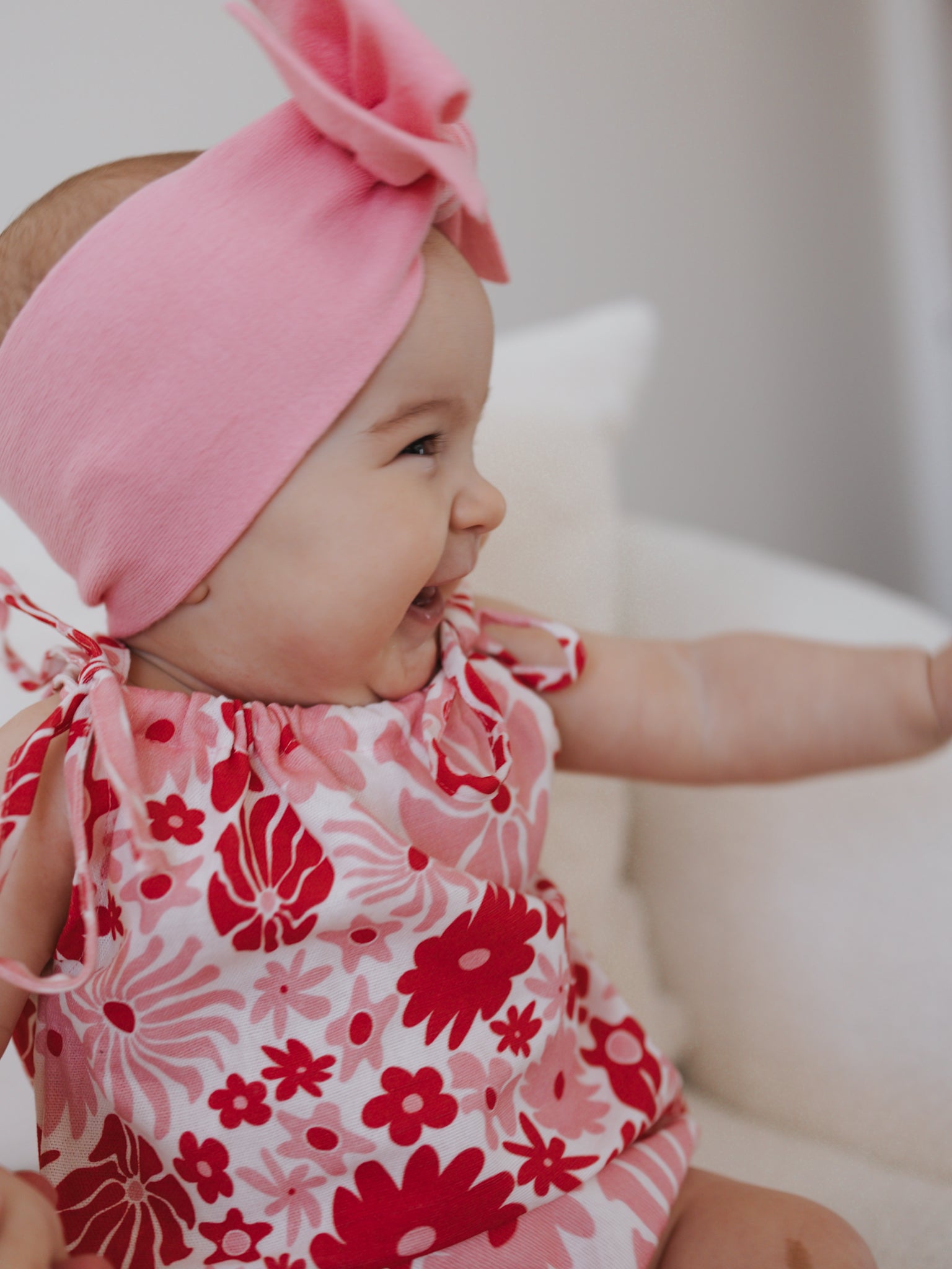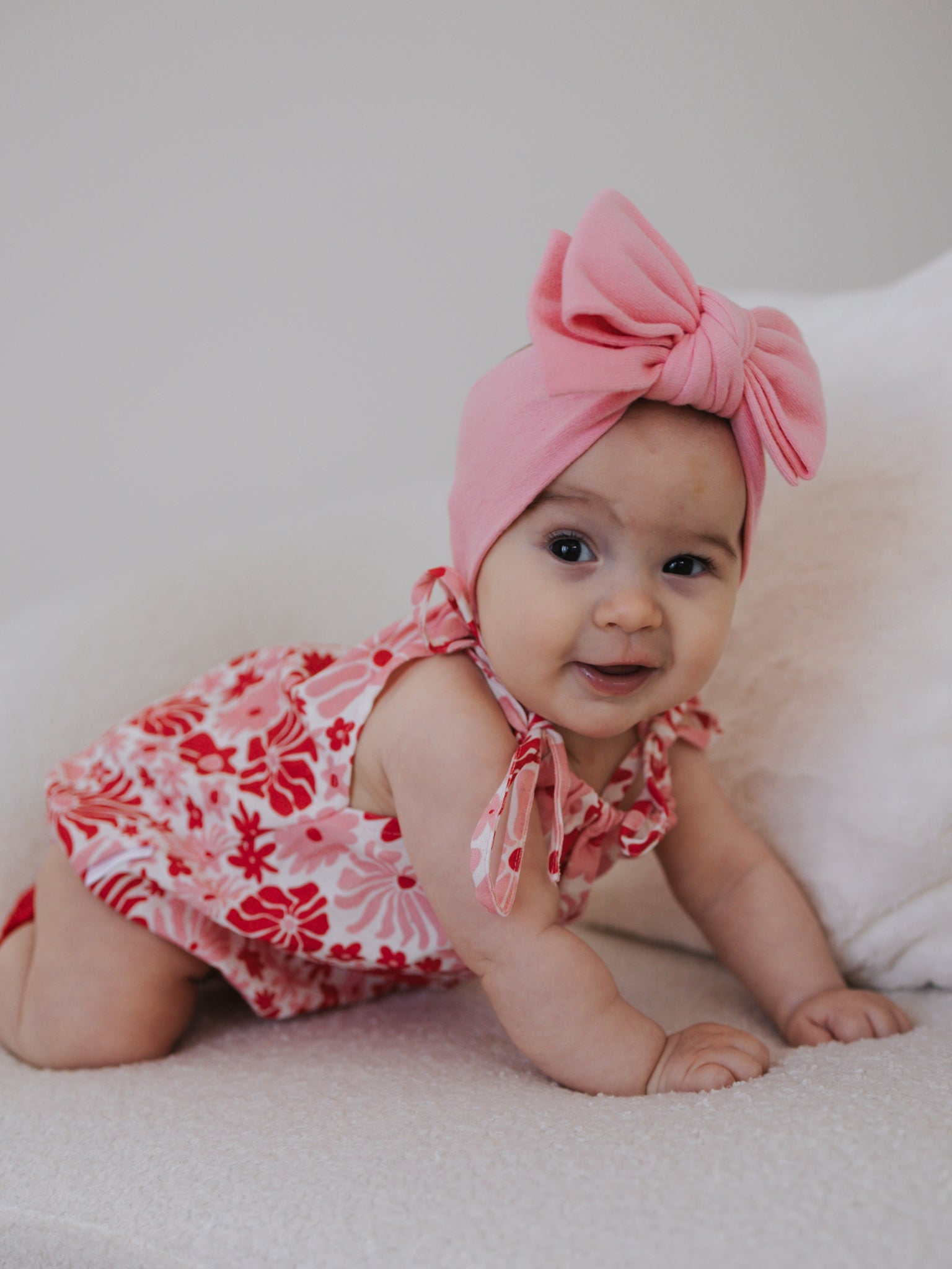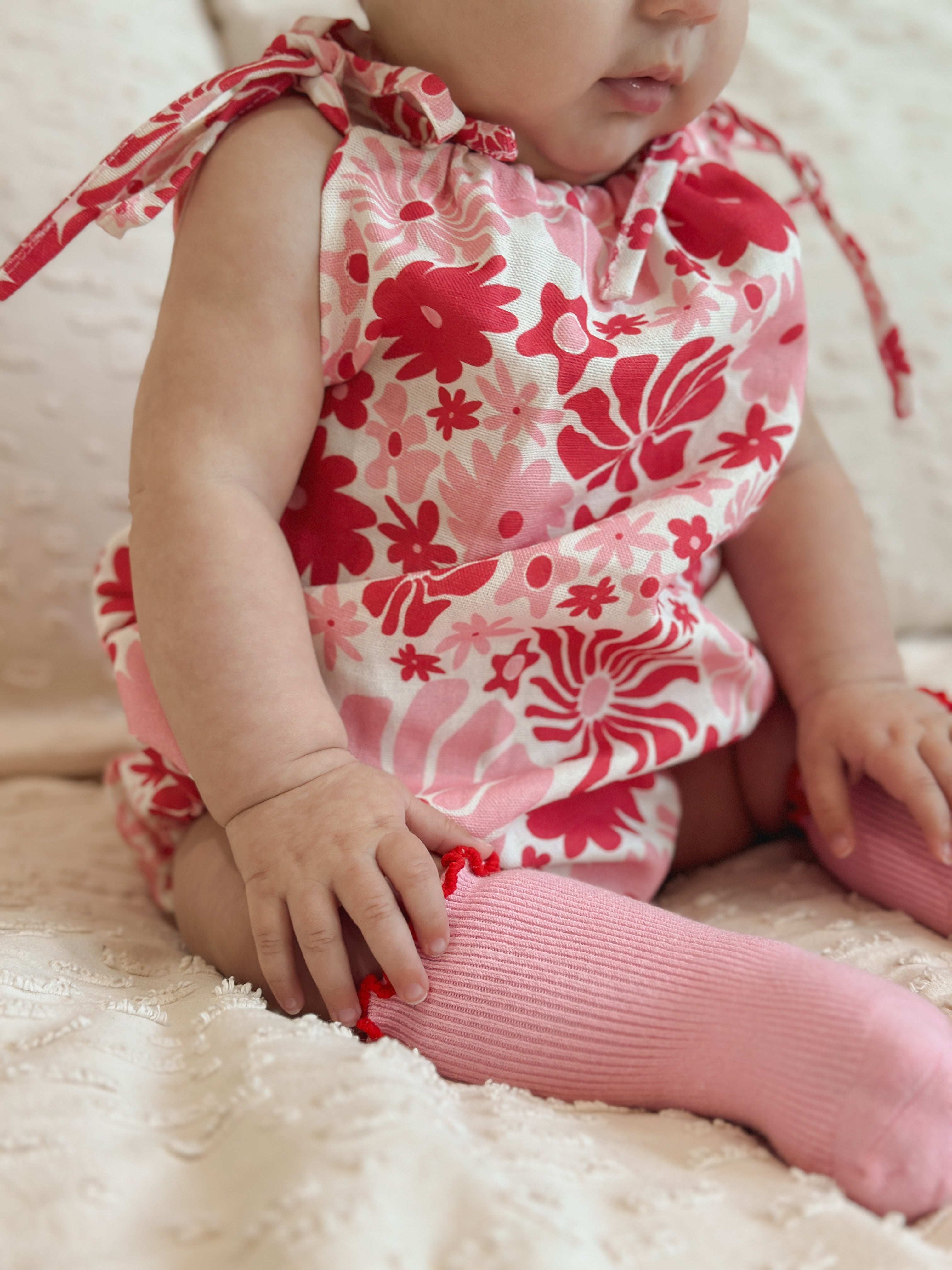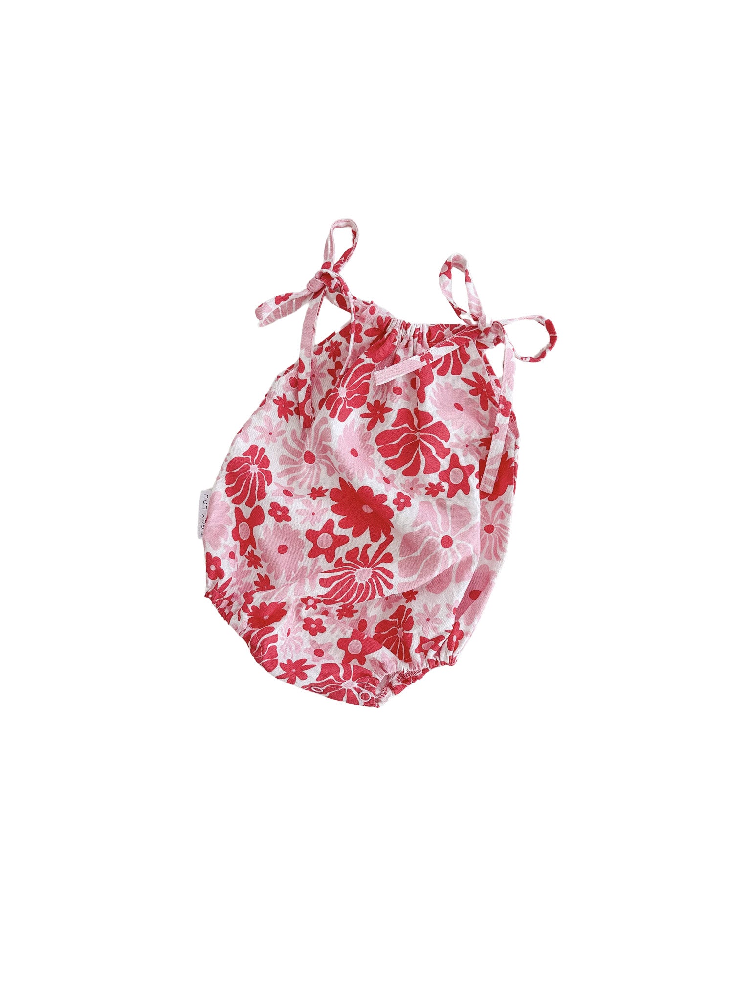 A lightweight linen blend romper featuring our Rosa printed design. Functional ties at shoulder and snap buttons at the crotch for easy on/off and nappy changes