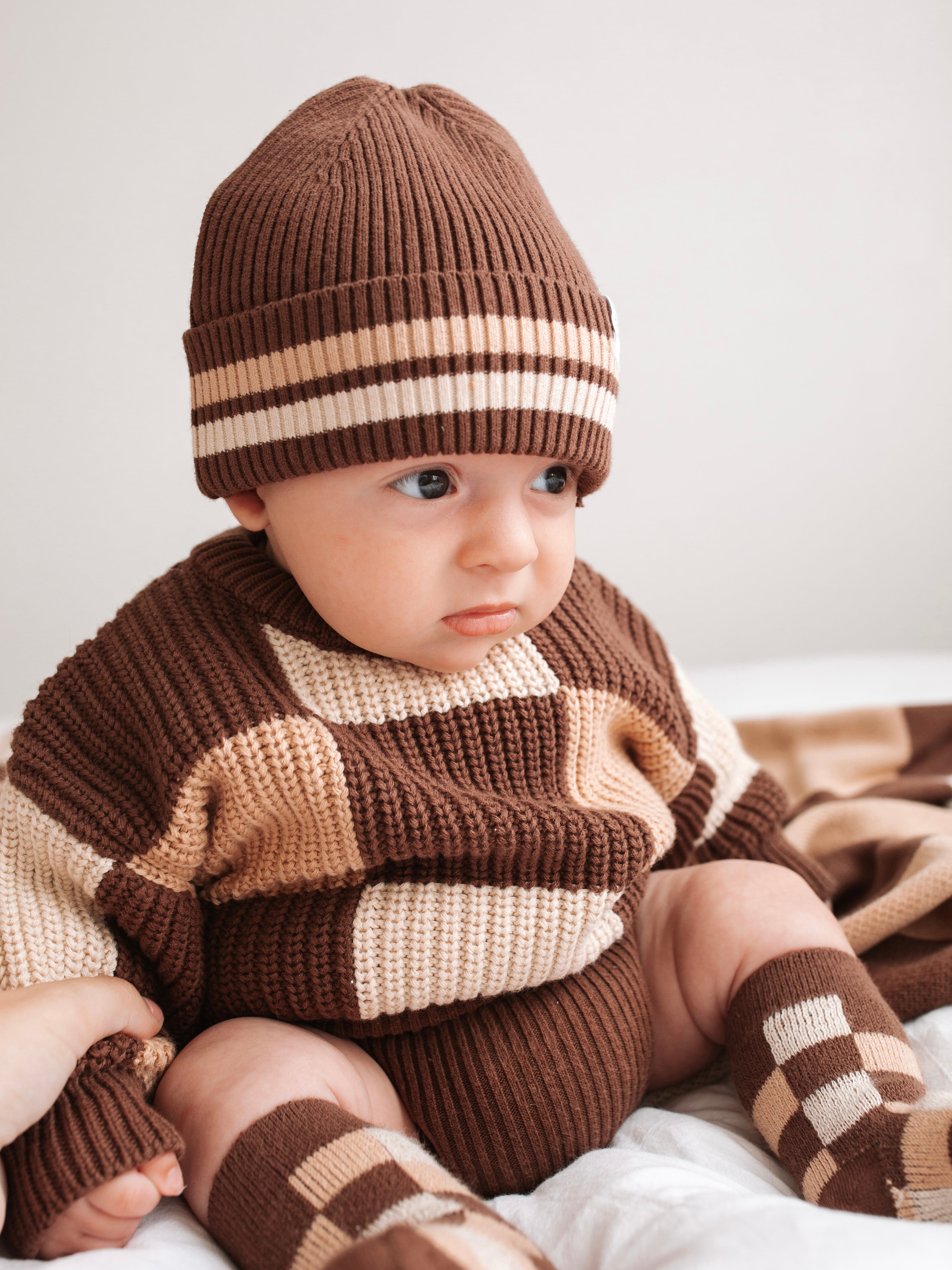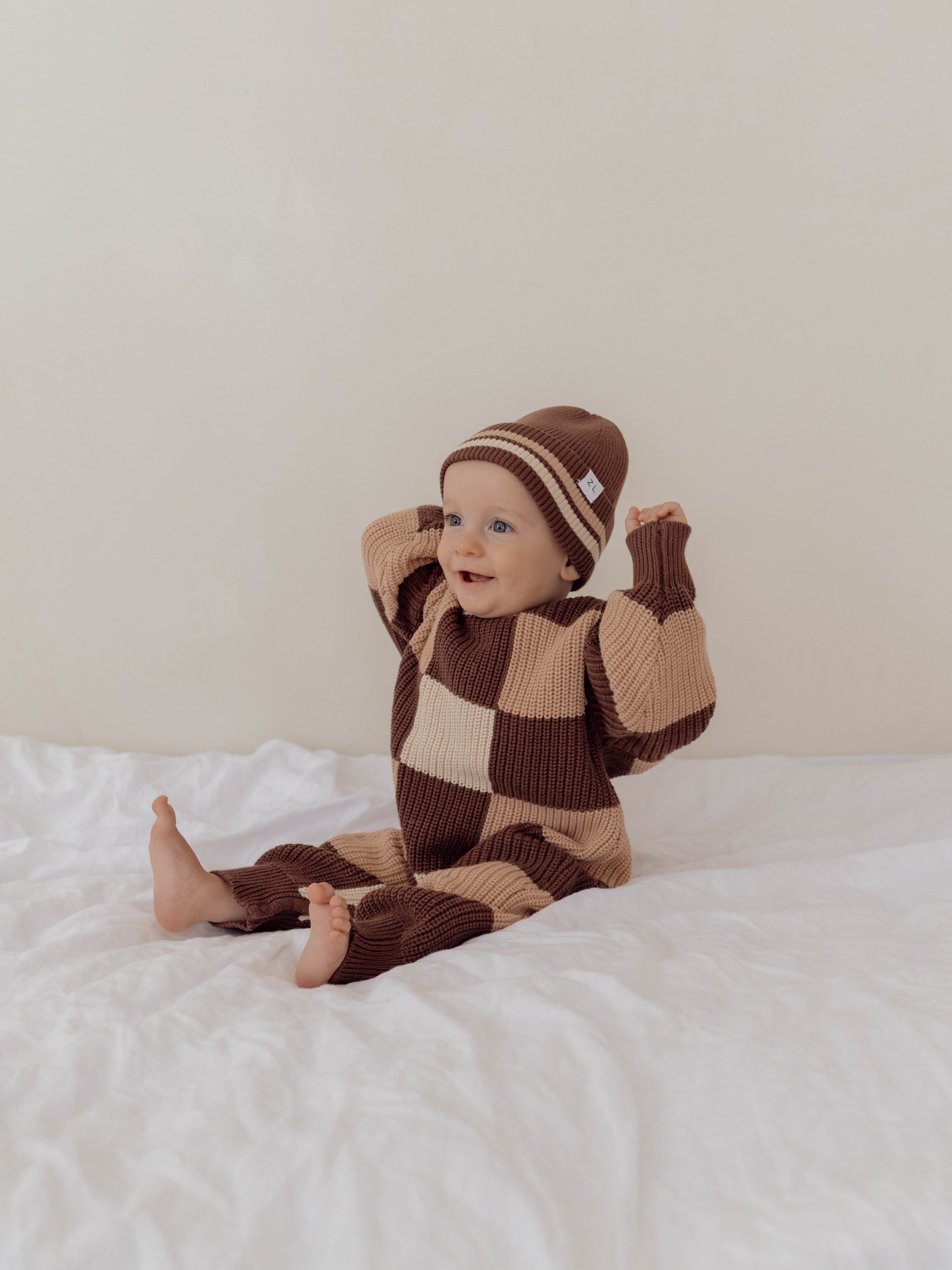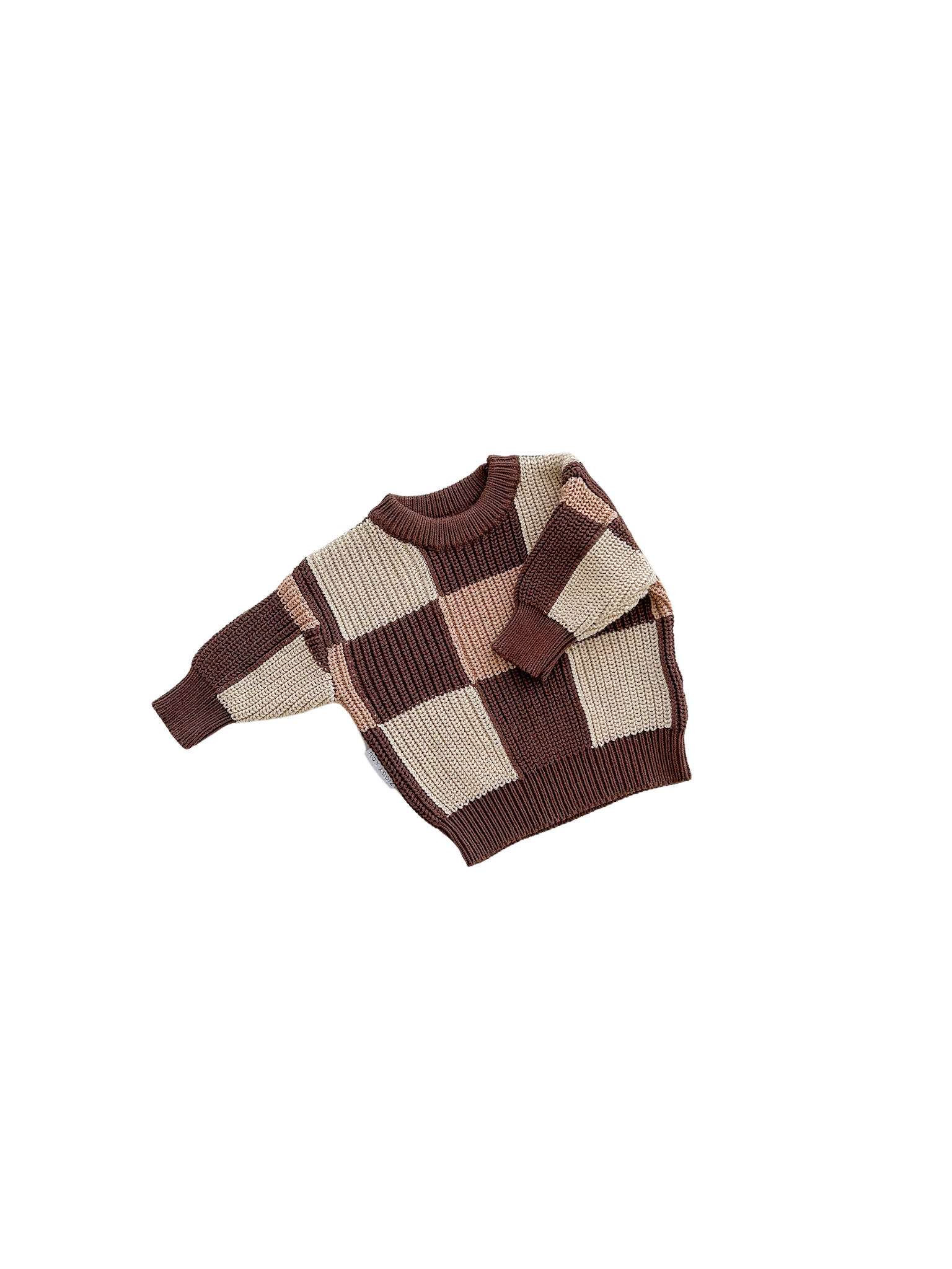 Our original chunky, knit jumper featuring our Checks design. Mix and match with our Checks, Pecan, Theo + Java Collections.