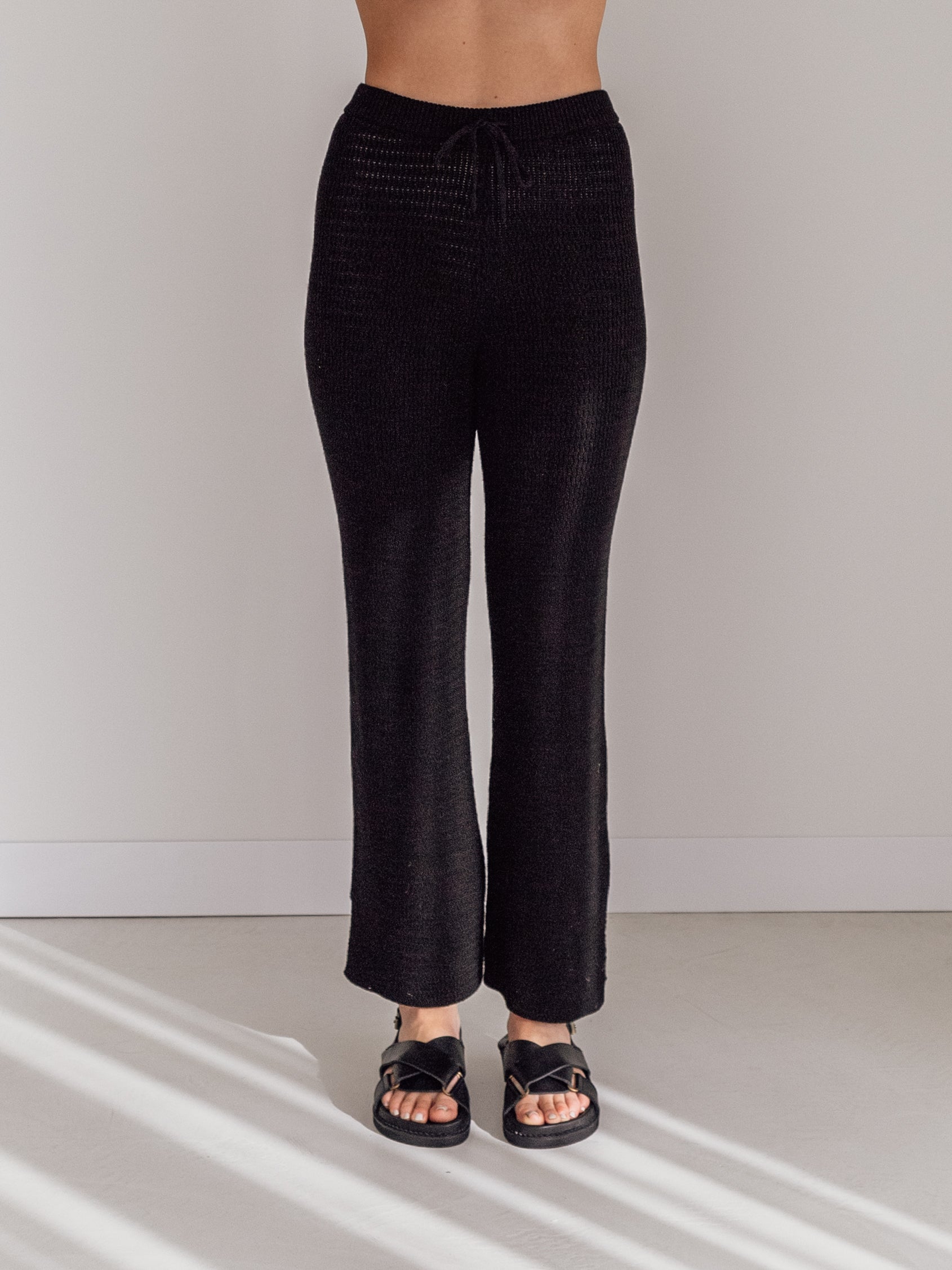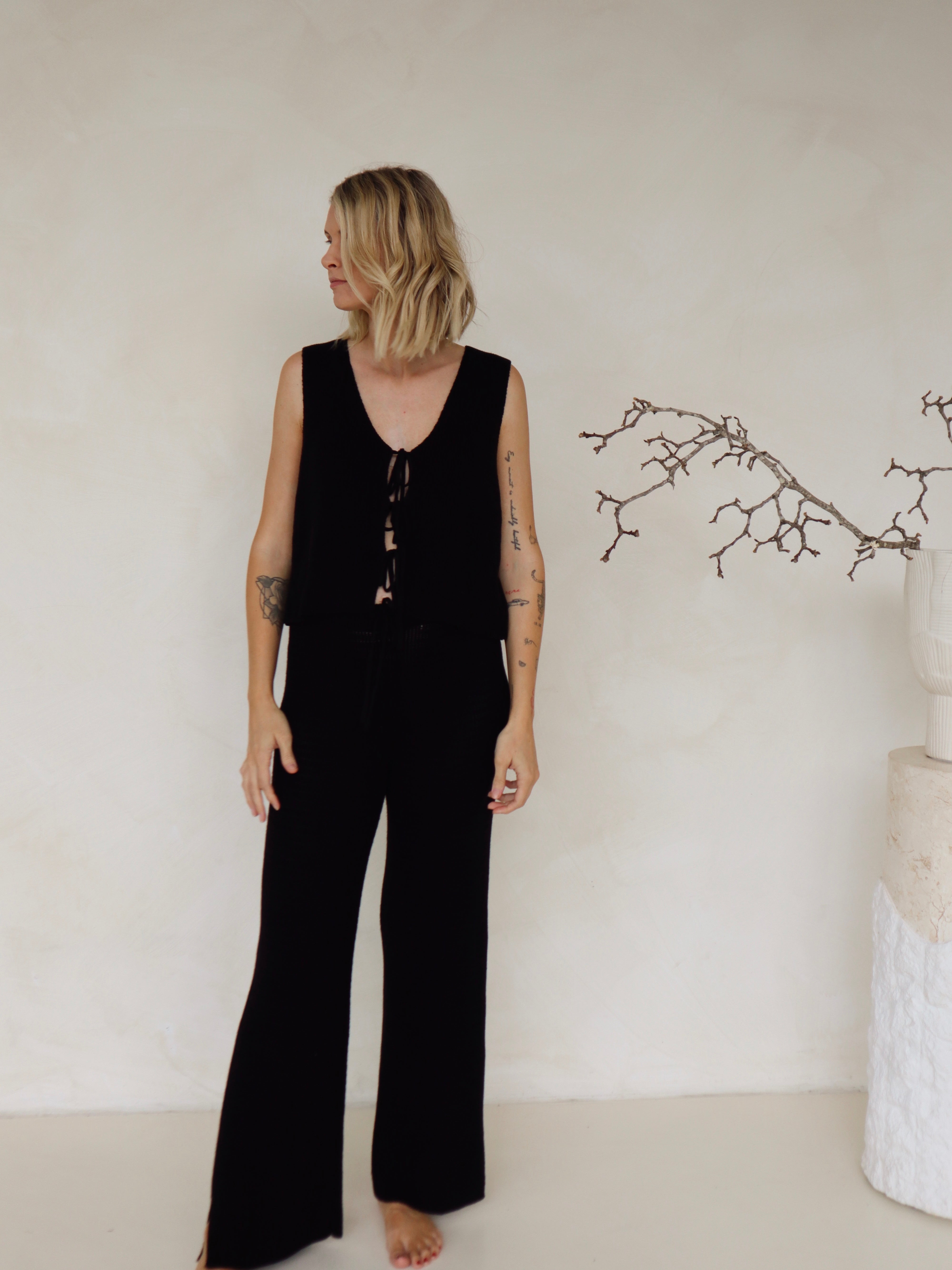 Loose knit pants with functional drawstring and soft elastic waist for the perfect fit. Small split on either side at ankles. Pair with Onyx knit singlet or top for the perfect outfit.