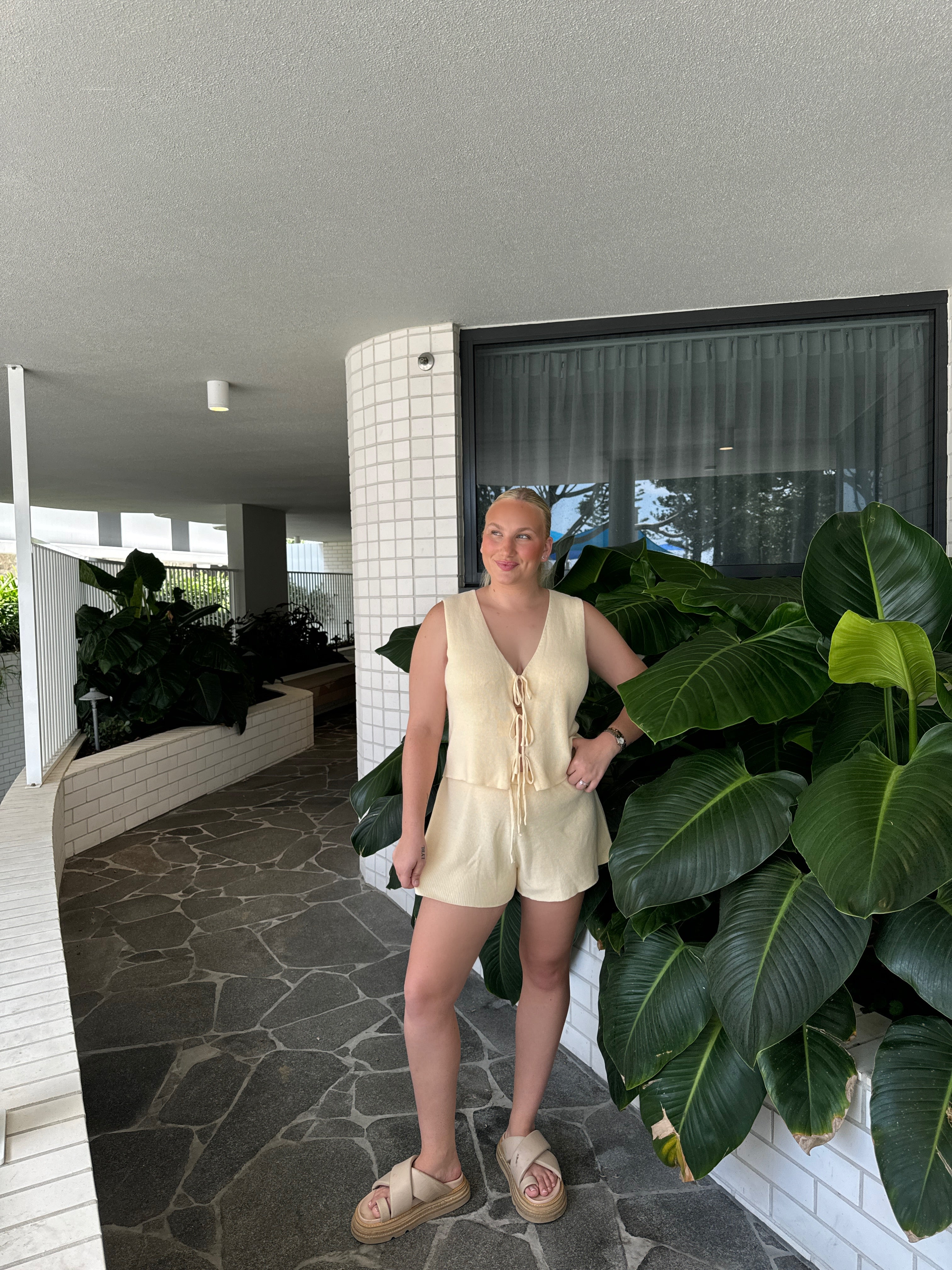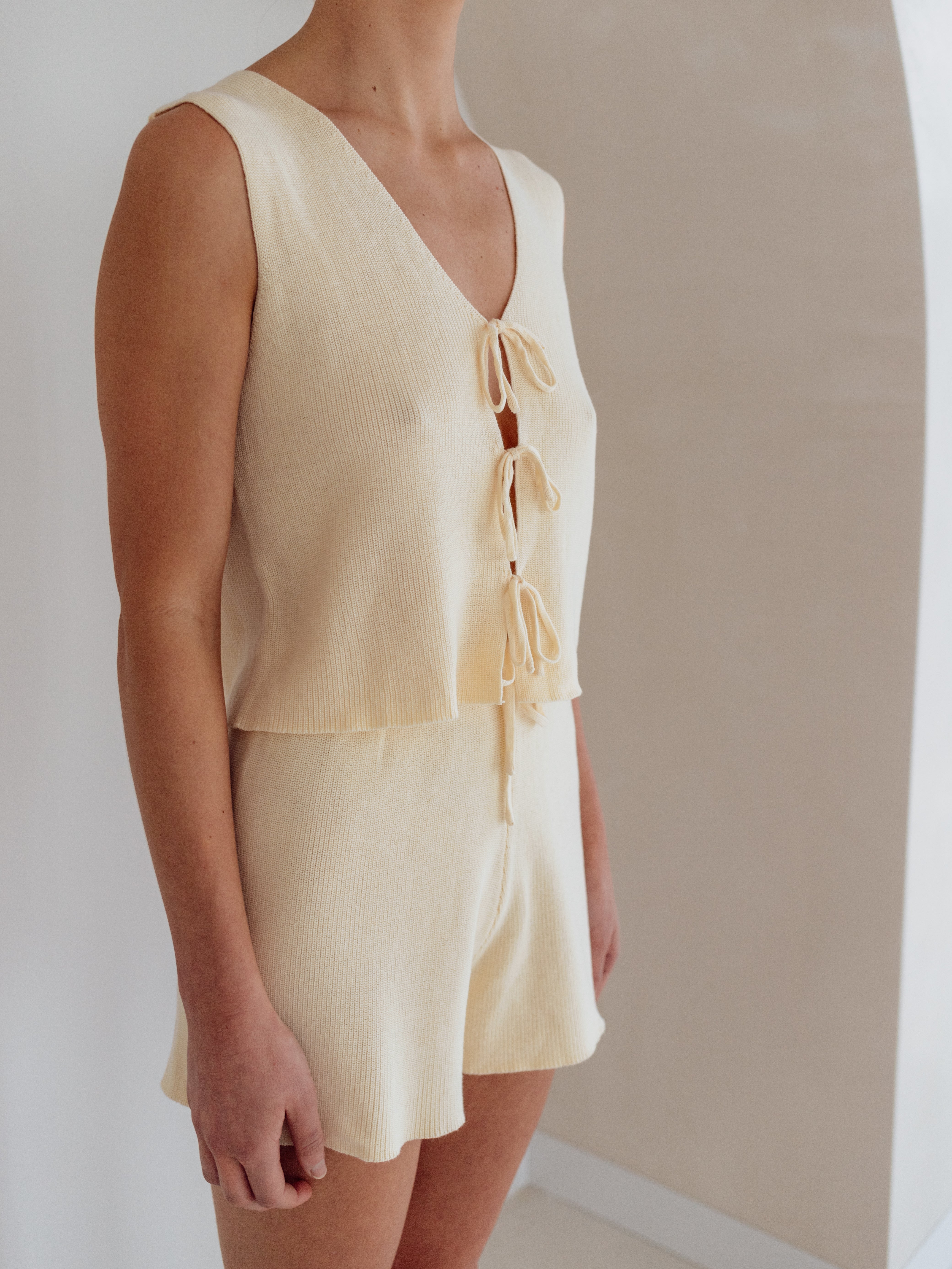 Women's knitted shorts in our Lemon colour. Functional drawstring and soft elastic waist for the perfect fit. Pair with our Lemon knit singlet from our Women's Summer Collection.