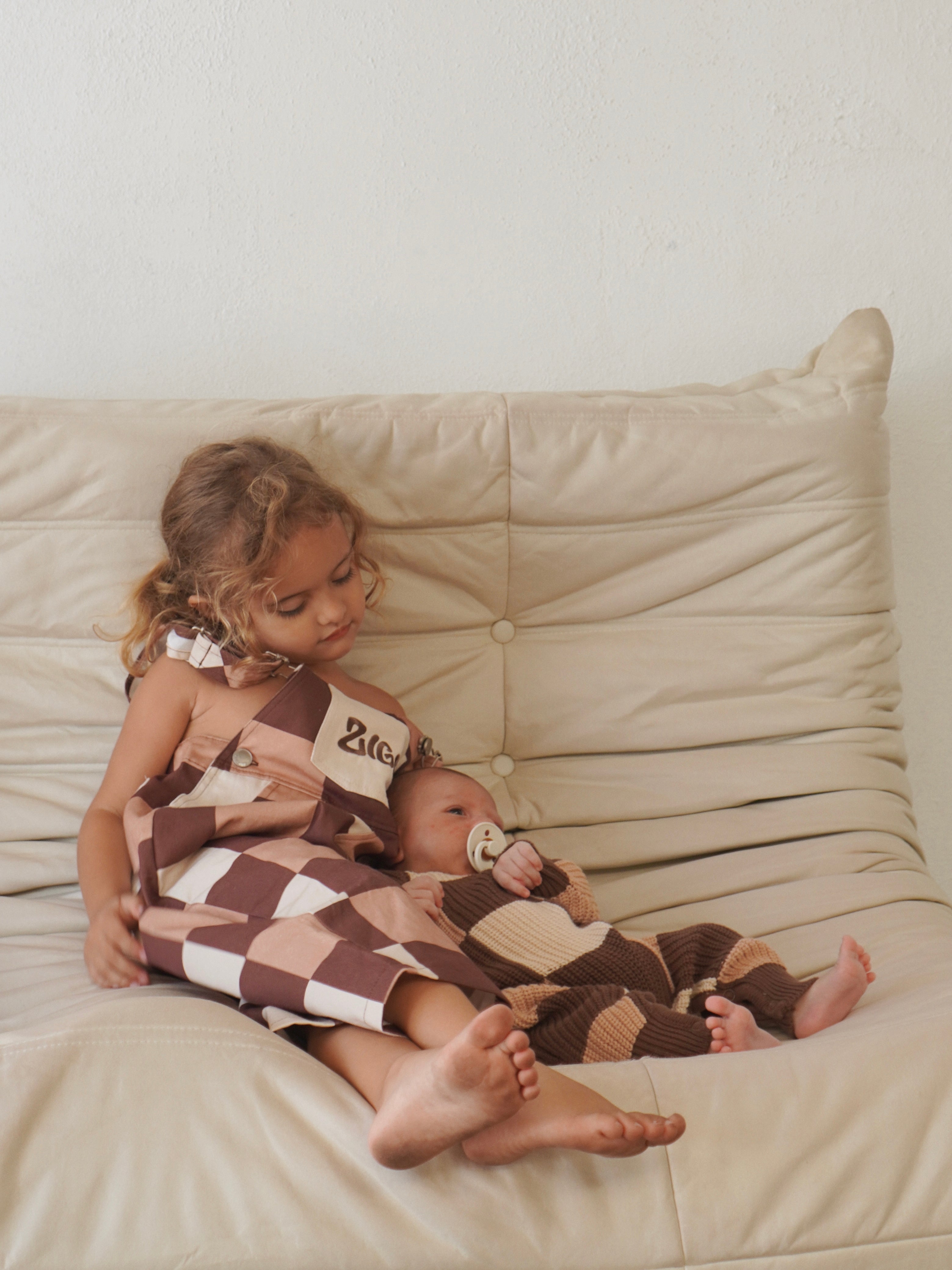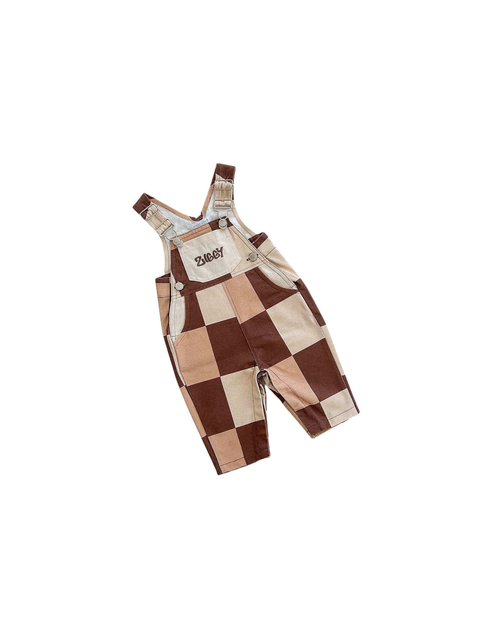 Canvas overalls feature our printed Checks design and Ziggy logo design embroidered on the front. Adjustable shoulder straps, 5 functional pockets and press snaps at crotch (up to 2Y) for easy nappy changes.