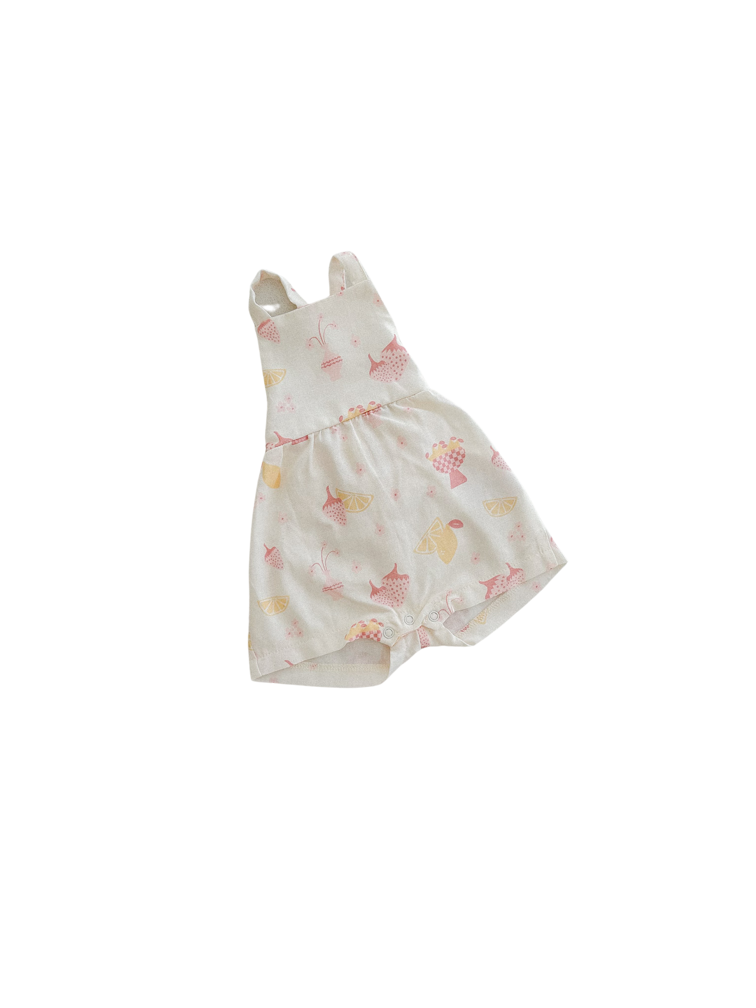 Linen blend playsuit featuring our August print. Elastic at back, adjustable shoulder straps that tie at middle of waist on the back.