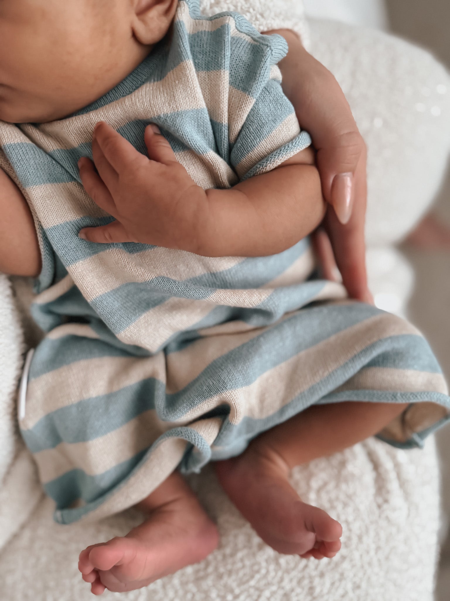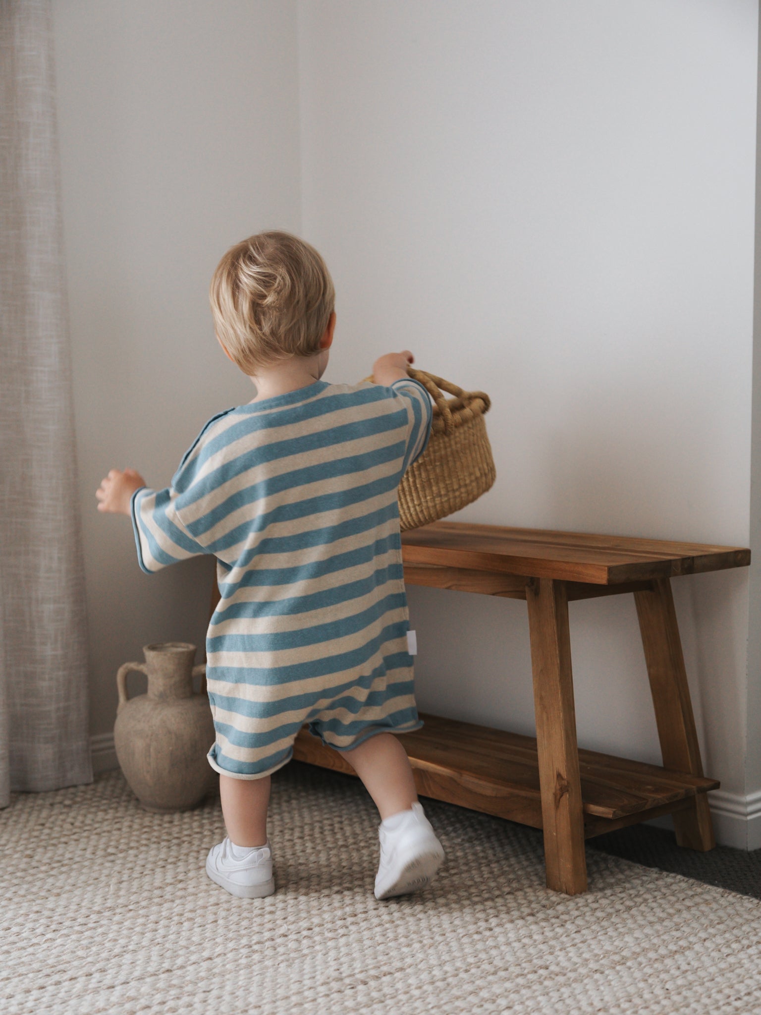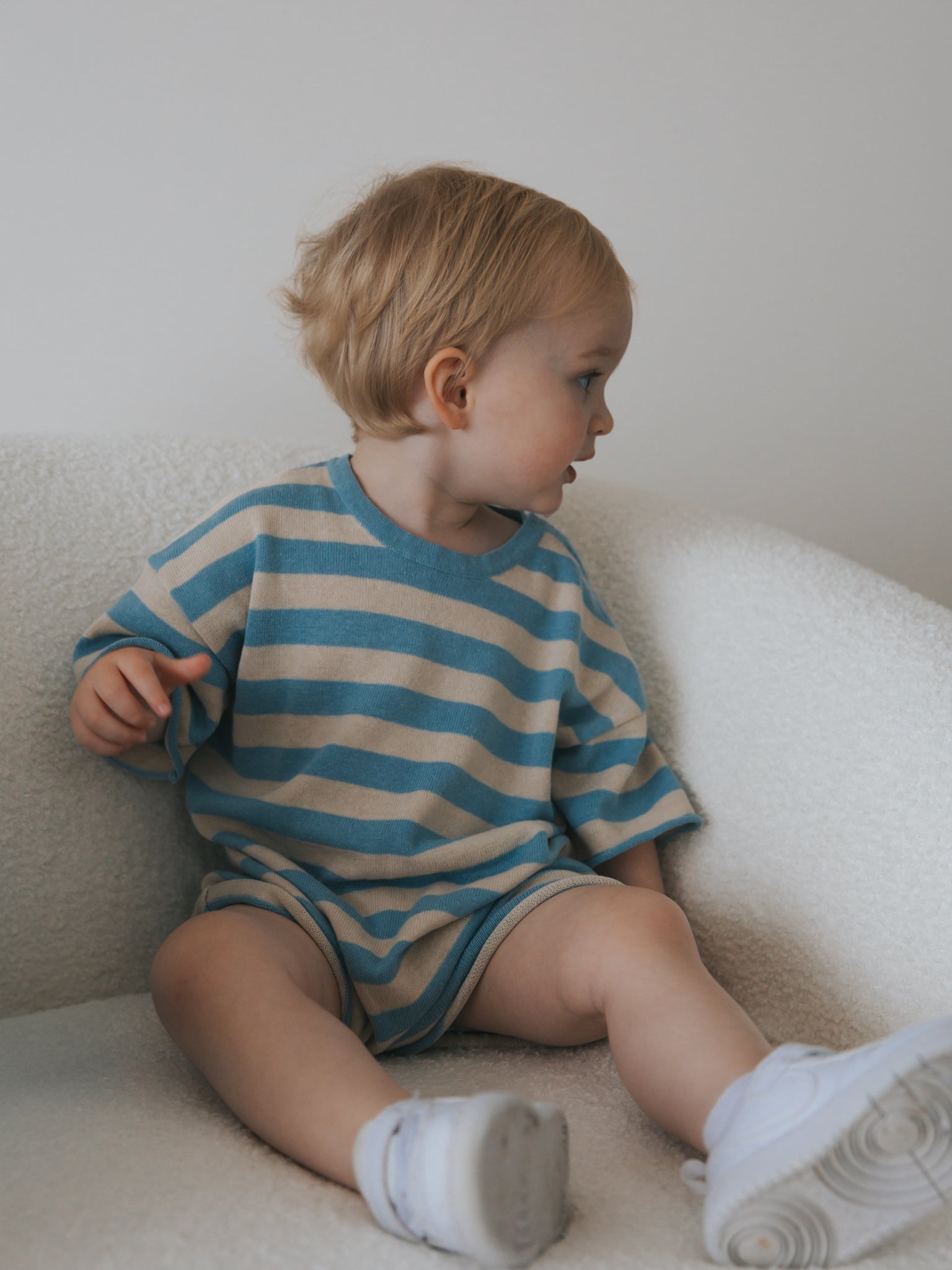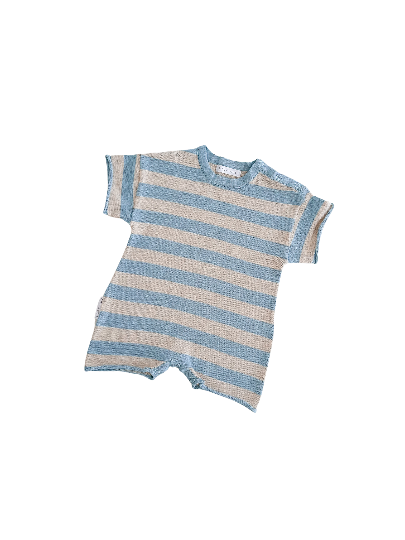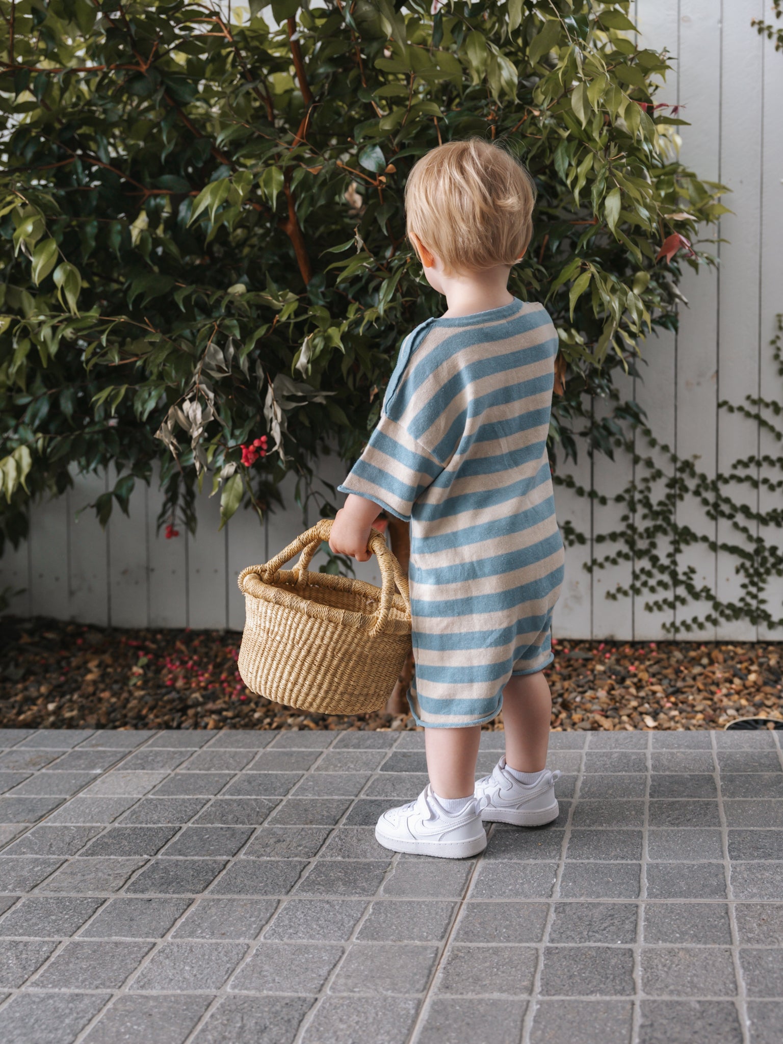 Short sleeve and relaxed fit playsuit featuring our Lake design. Functional press snaps at crotch for easy nappy changes and press snaps at shoulders for easy on/off. Mix and match with items from our Costa + Lake Collections.