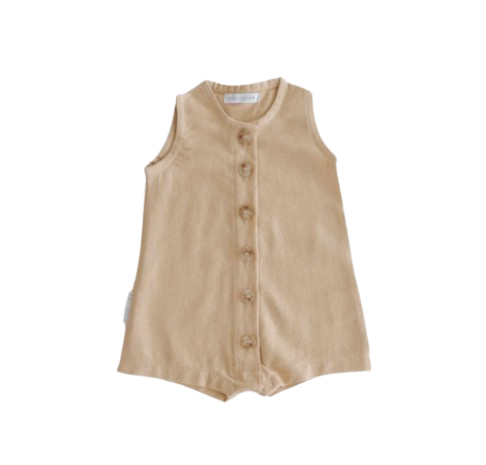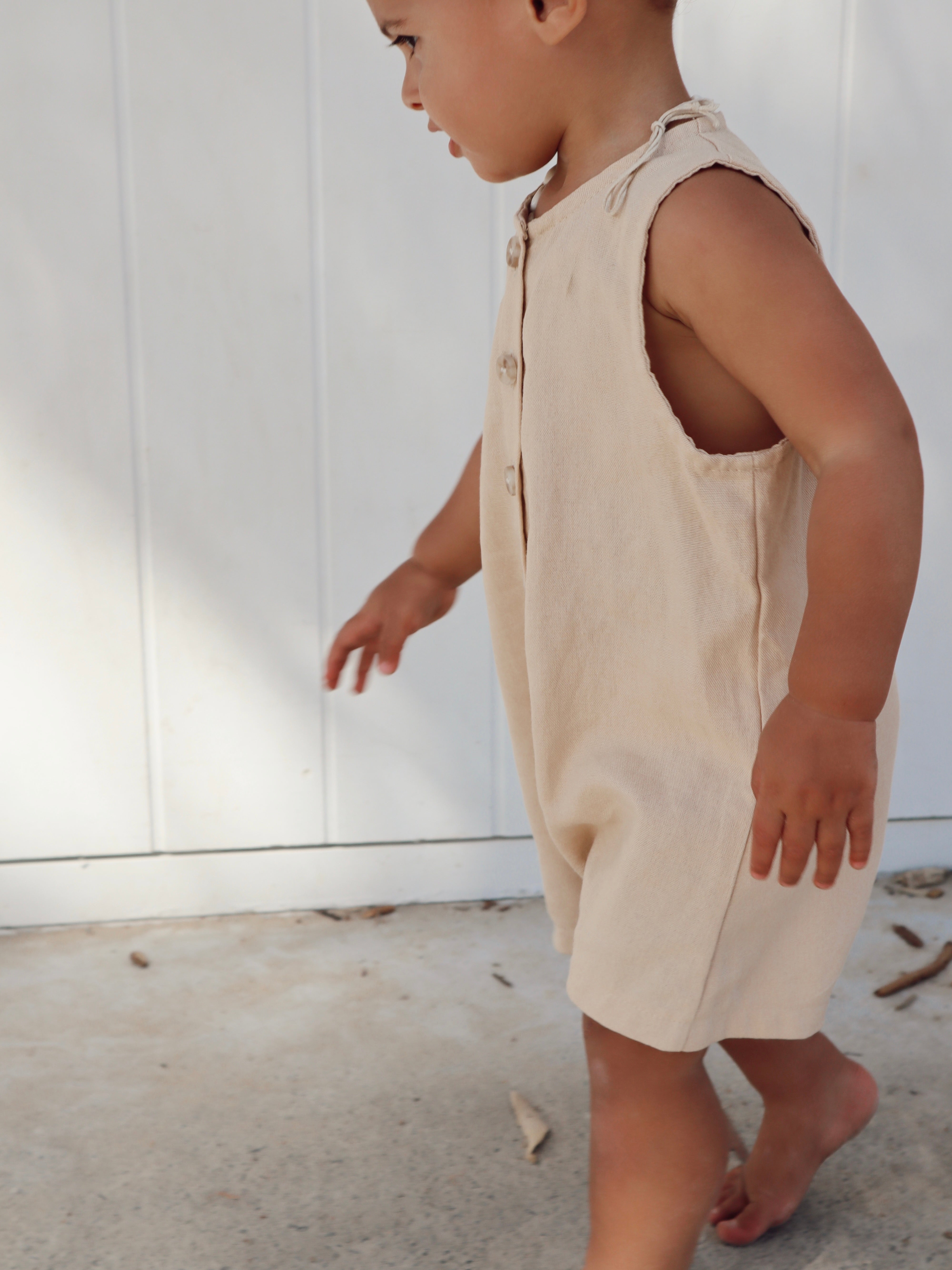 Linen blend romper with functional buttons down the front and press snaps at crotch for easy nappy changes.