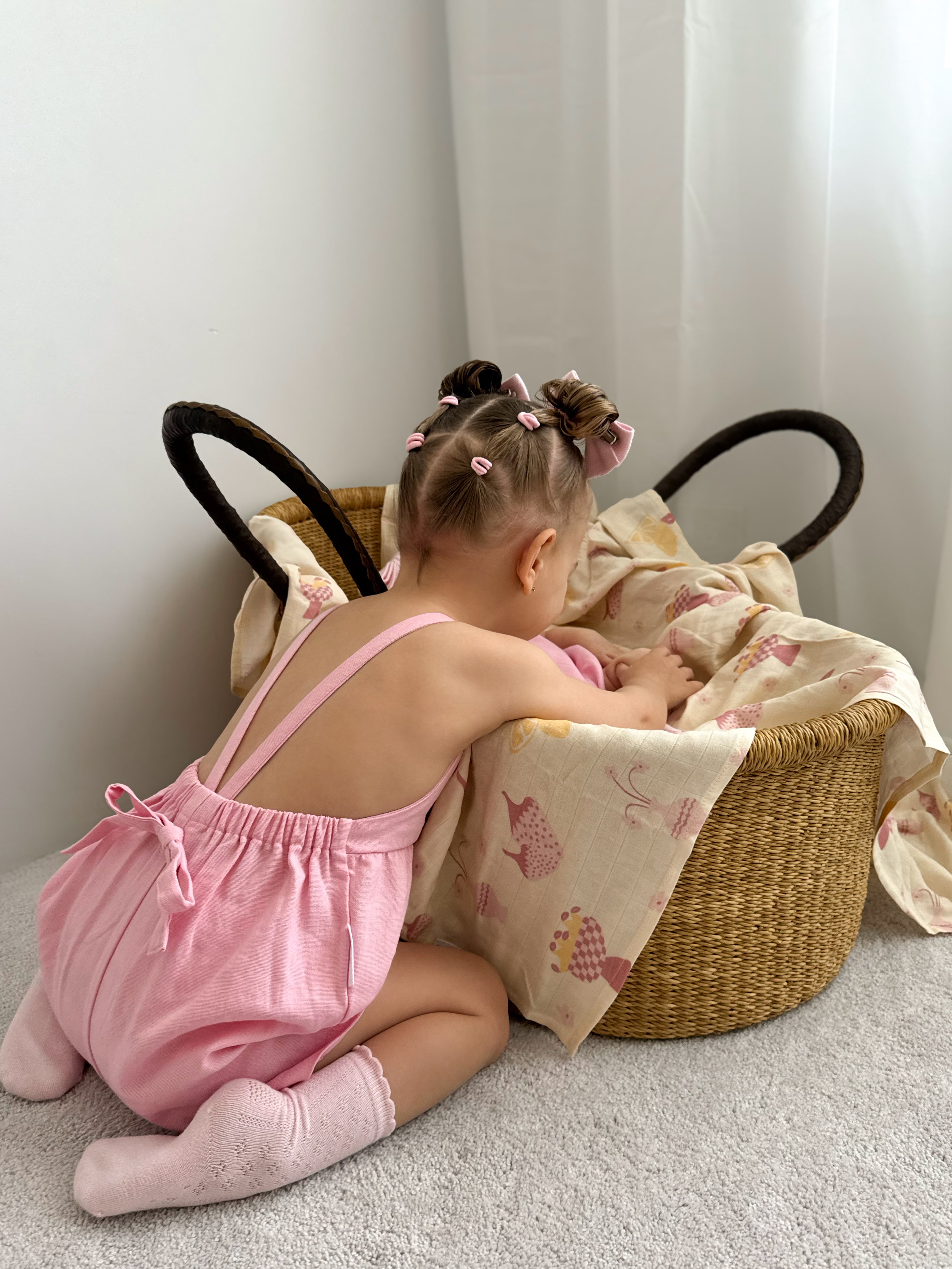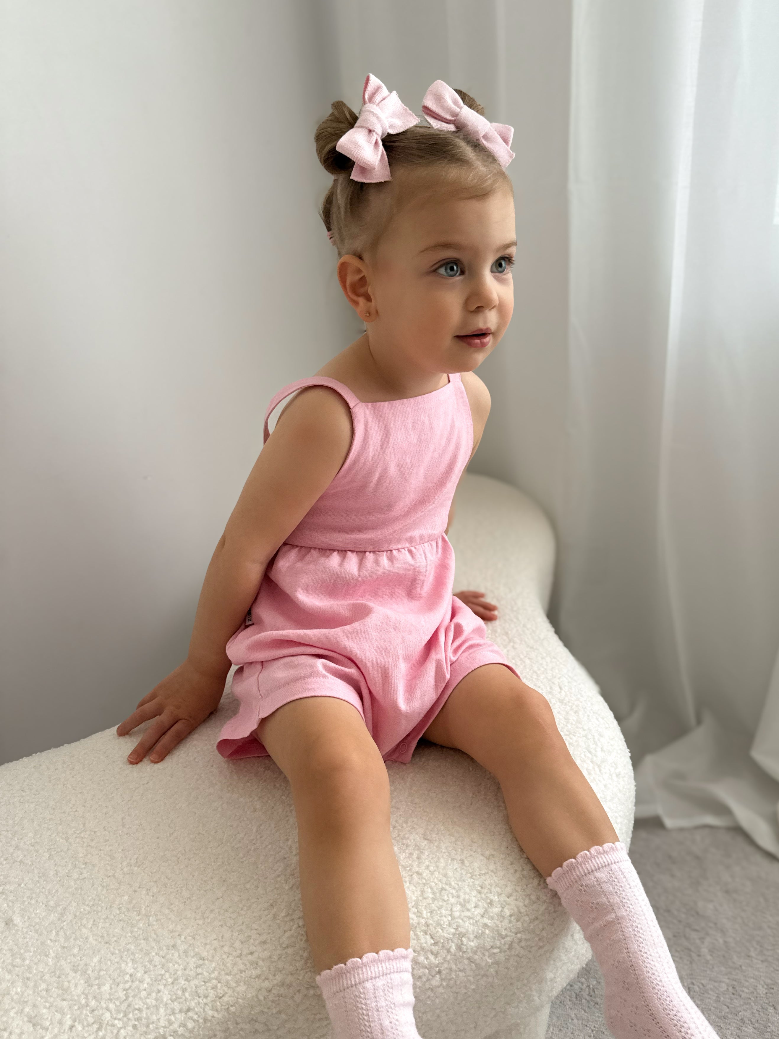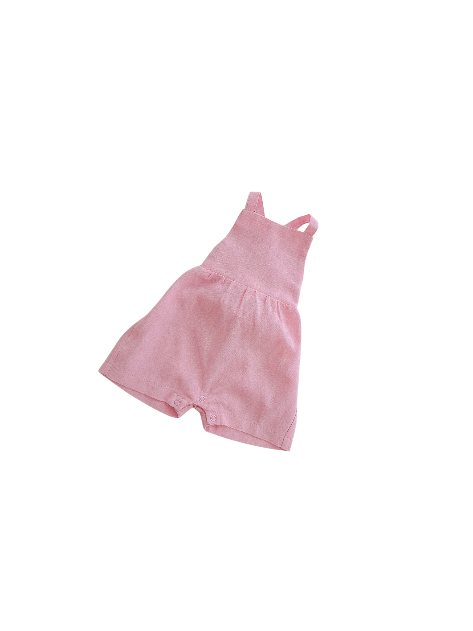 Linen blend playsuit in our Paloma colour. Elastic at back, adjustable shoulder straps that tie at middle of waist on the back.