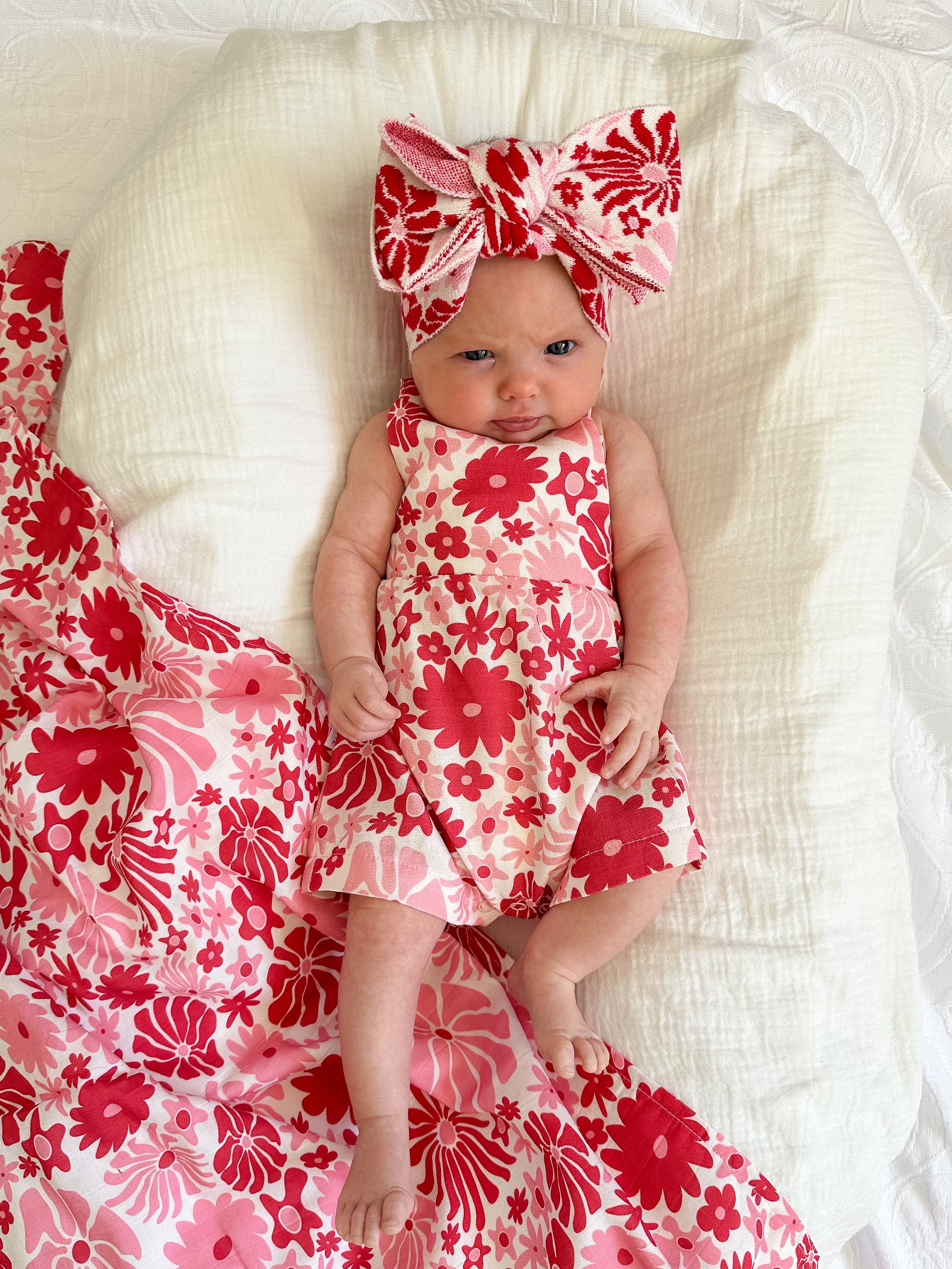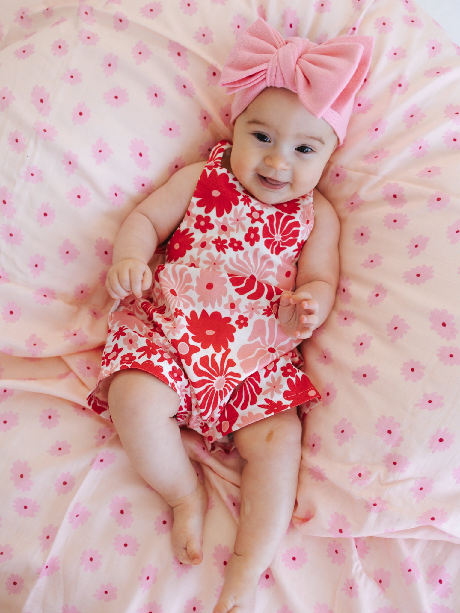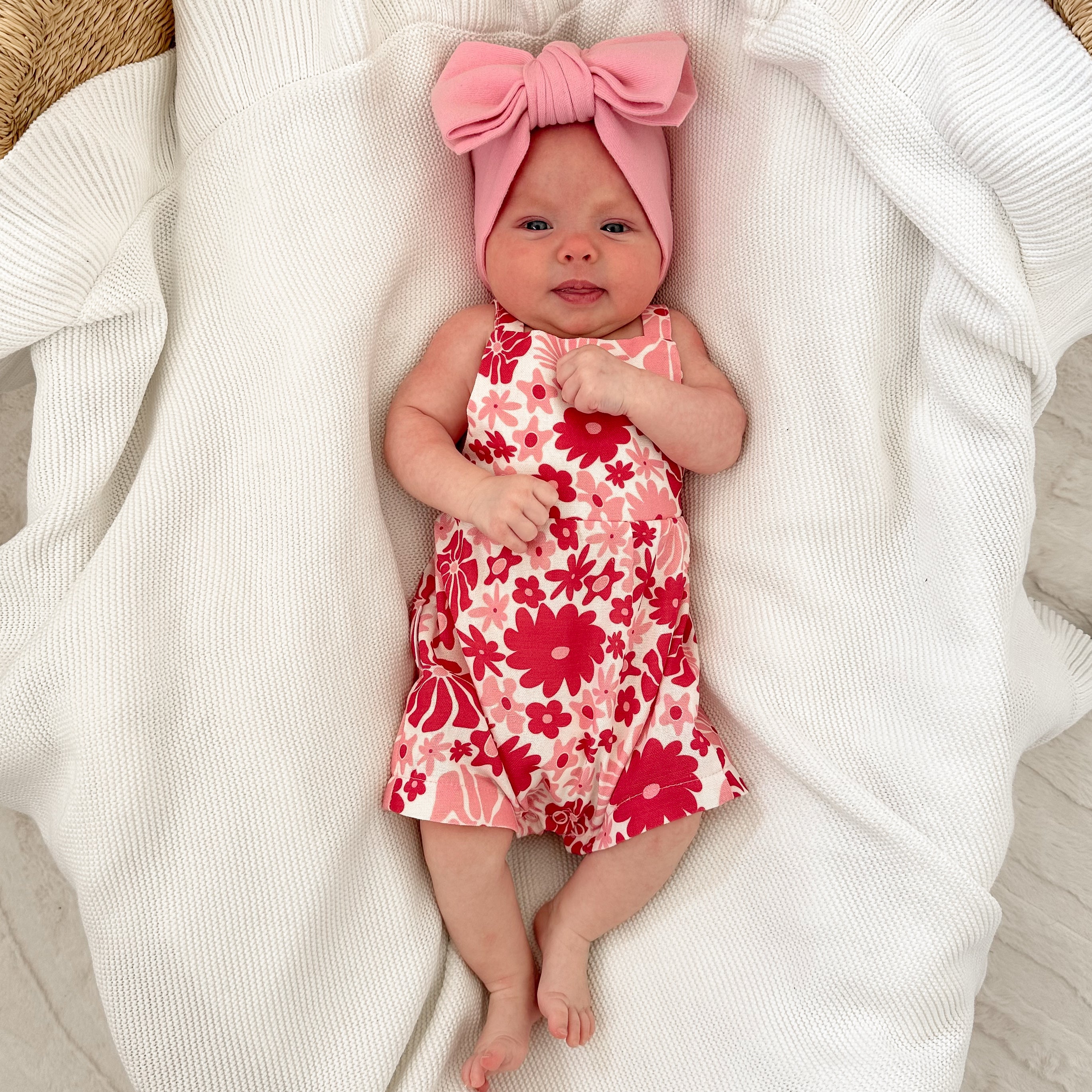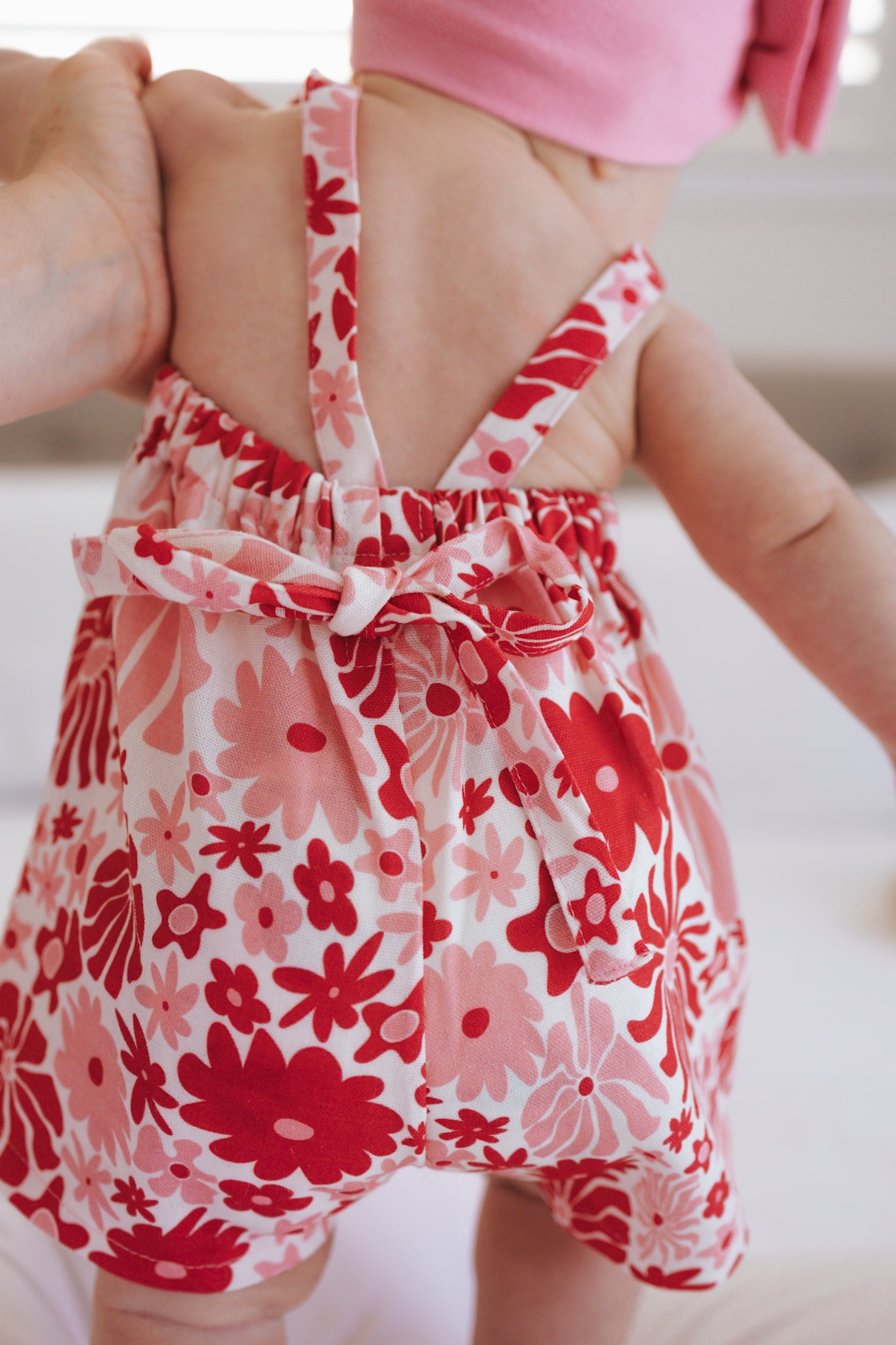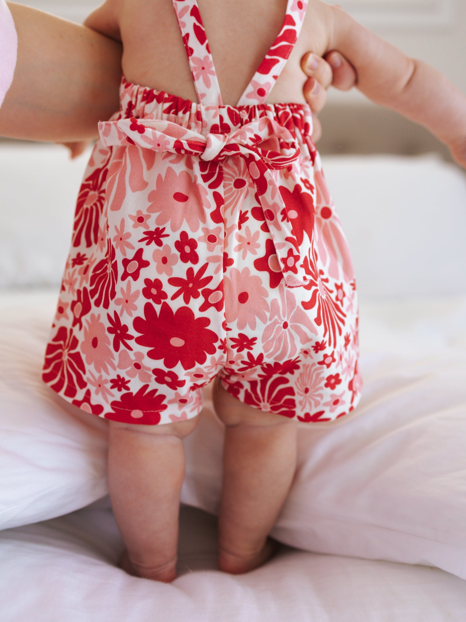 Linen blend playsuit featuring our Rosa print. Elastic at back, adjustable shoulder straps that tie at middle of waist on the back. Mix and match with our Elodie, Rosa + Maeve Collections for the perfect outfit.