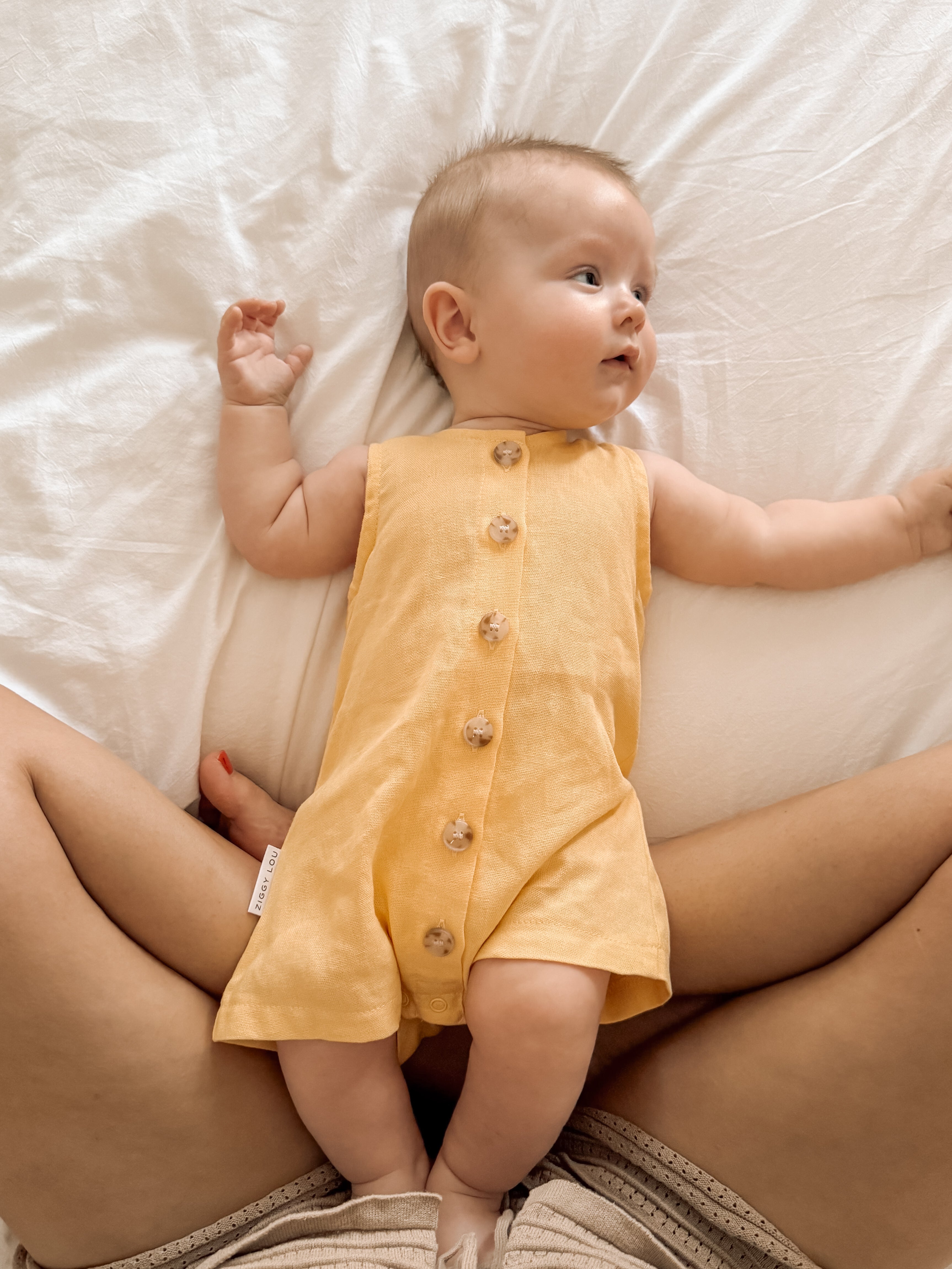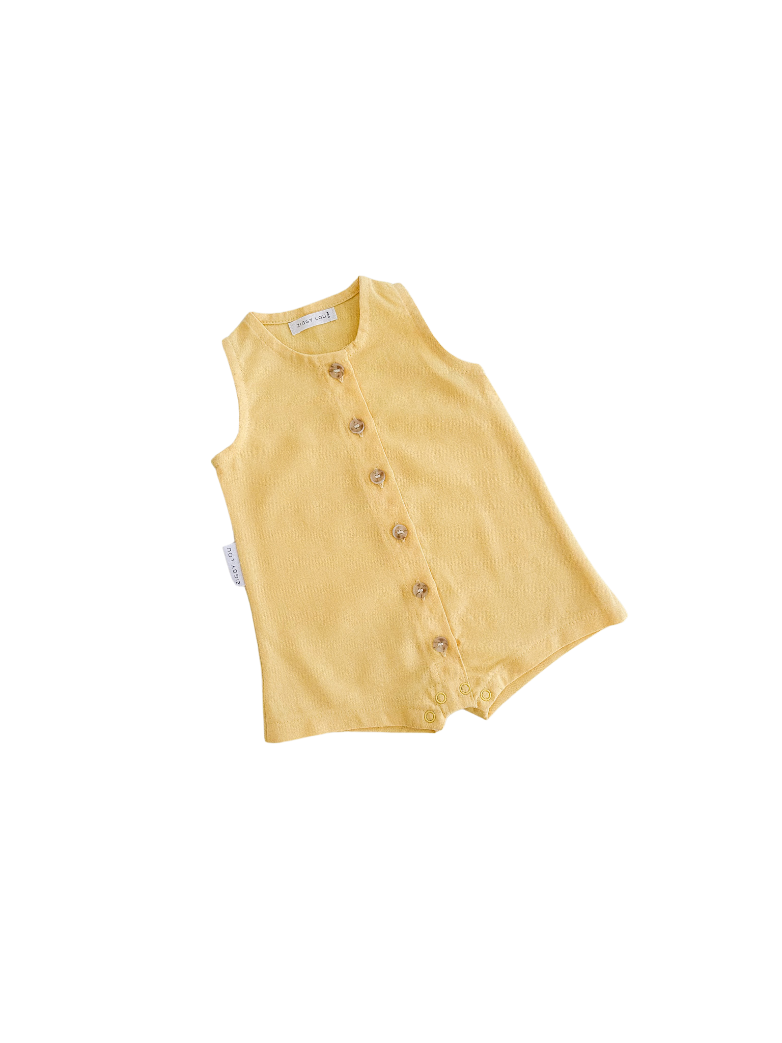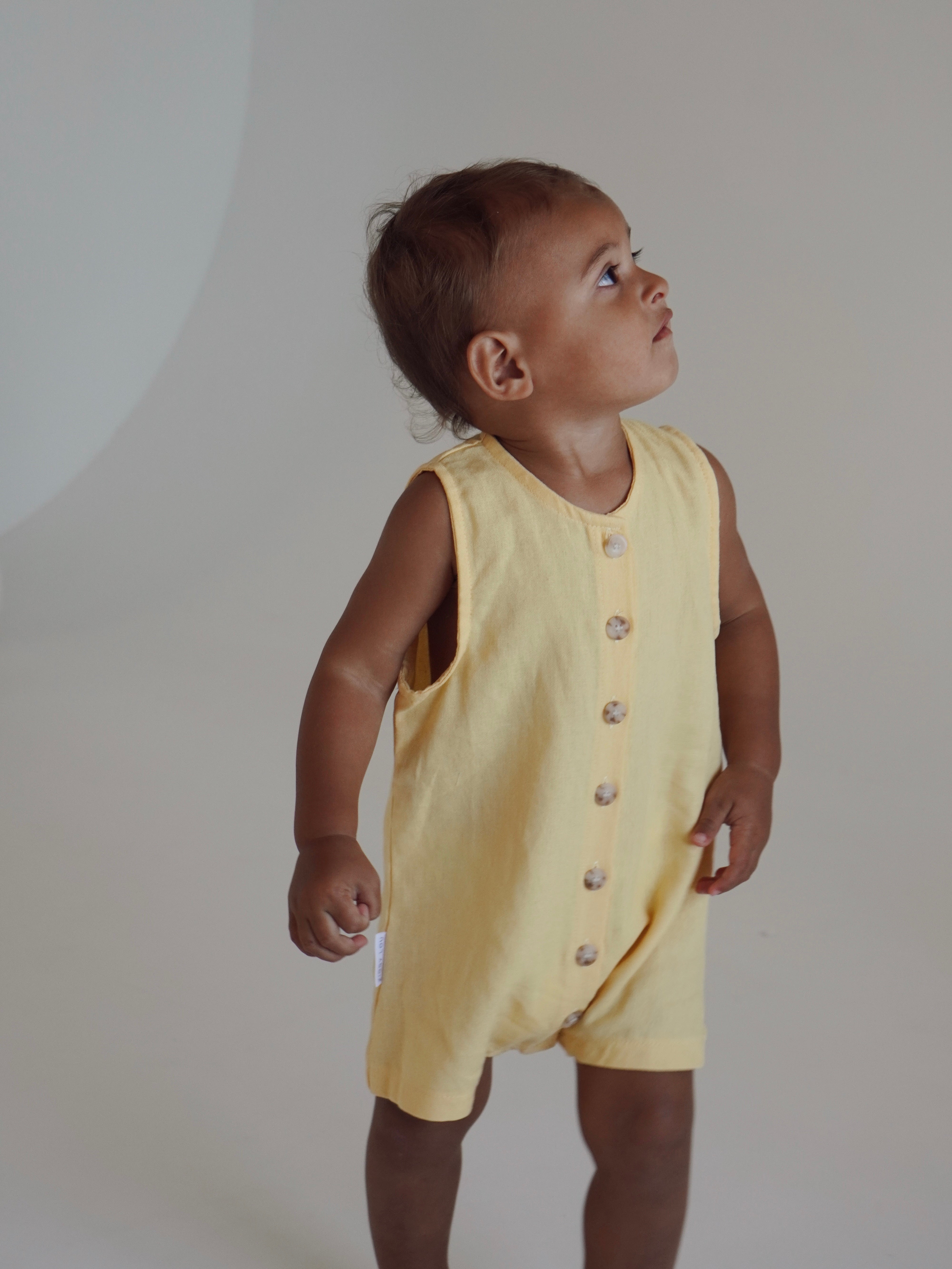 Linen blend romper with functional buttons down the front and press snaps at crotch for easy nappy changes. Mix and Match with items from our Costa + Sully Summer Collections.
