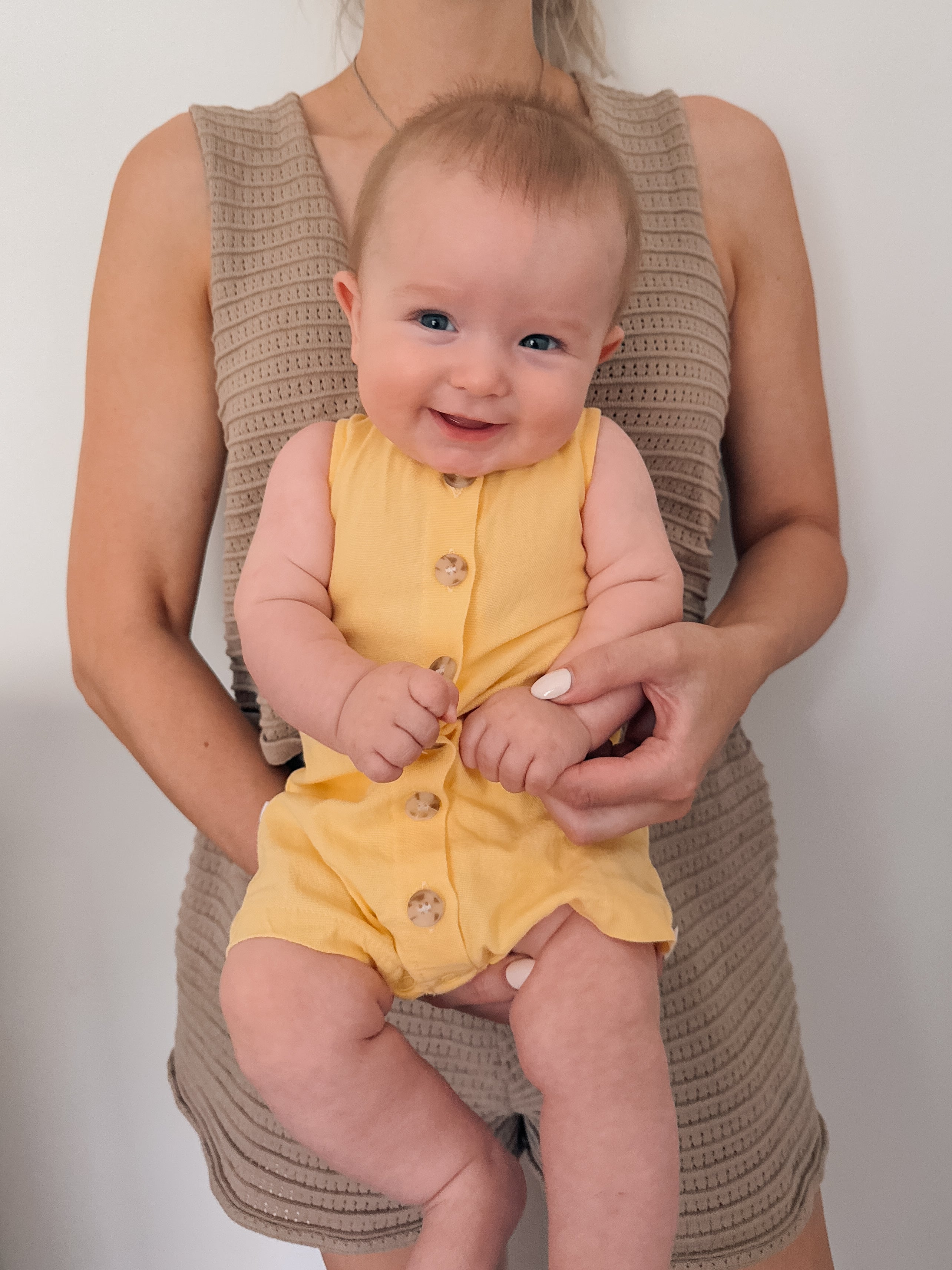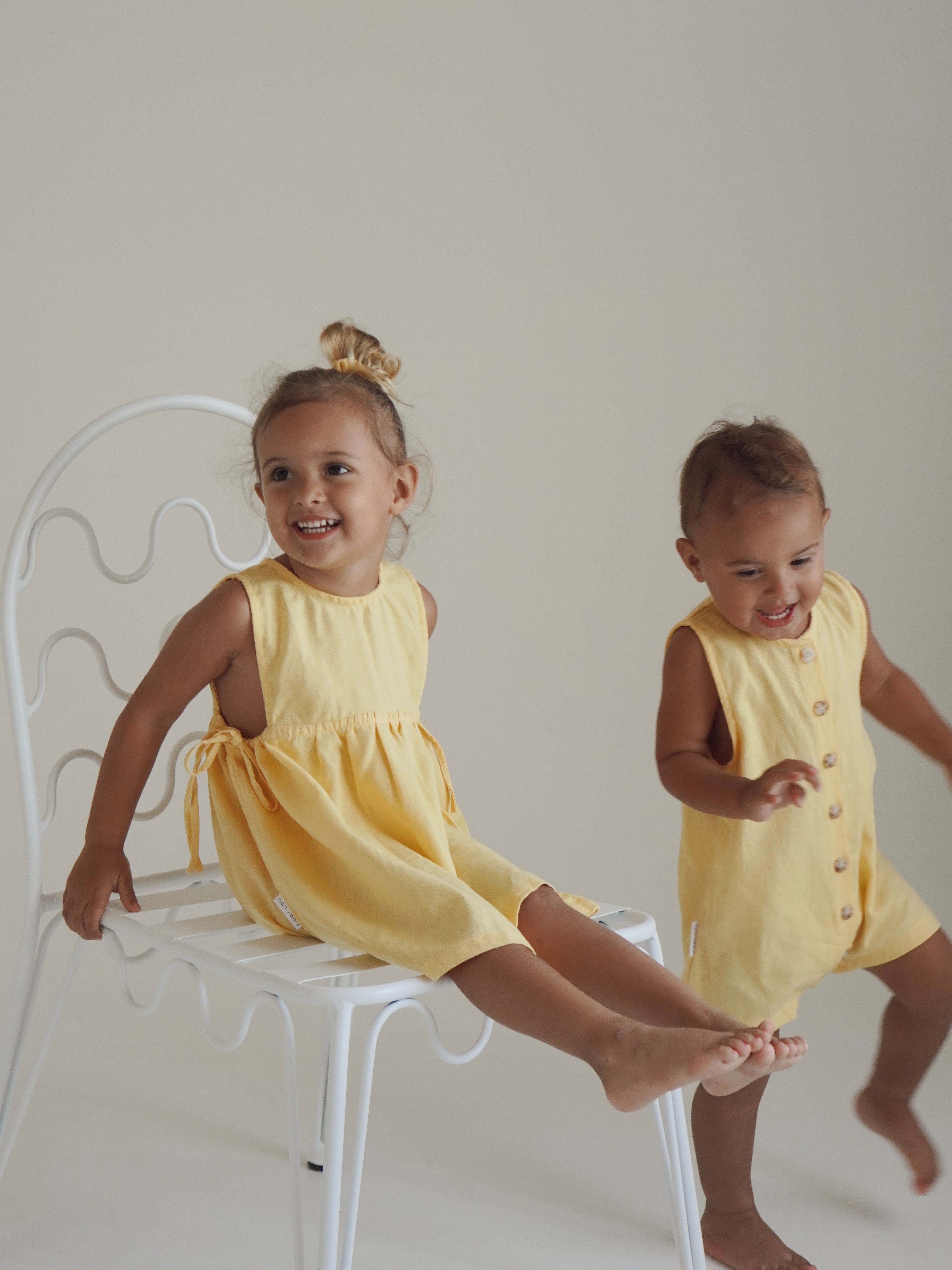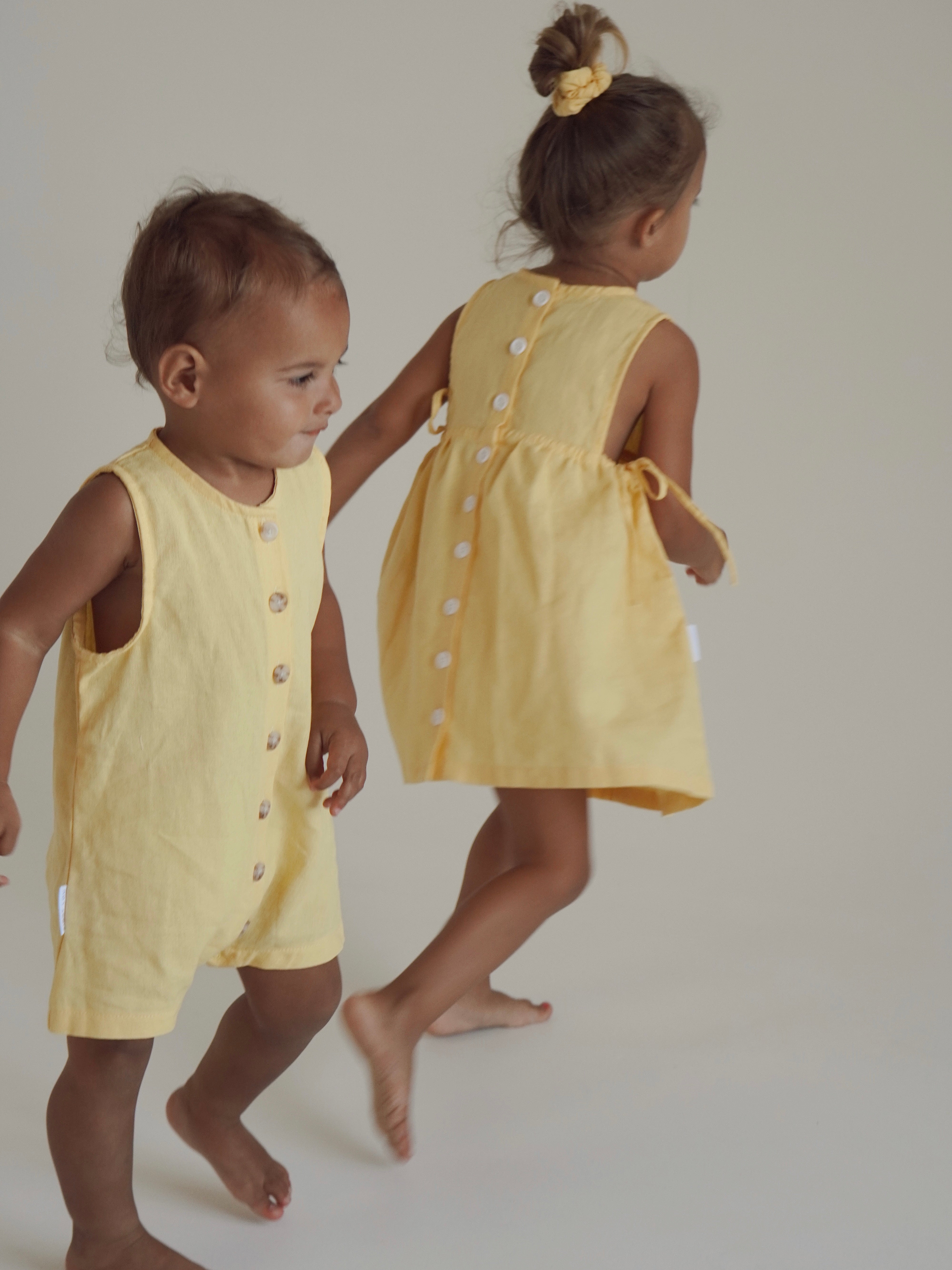 Linen blend romper with functional buttons down the front and press snaps at crotch for easy nappy changes. Mix and Match with items from our Costa + Sully Summer Collections.