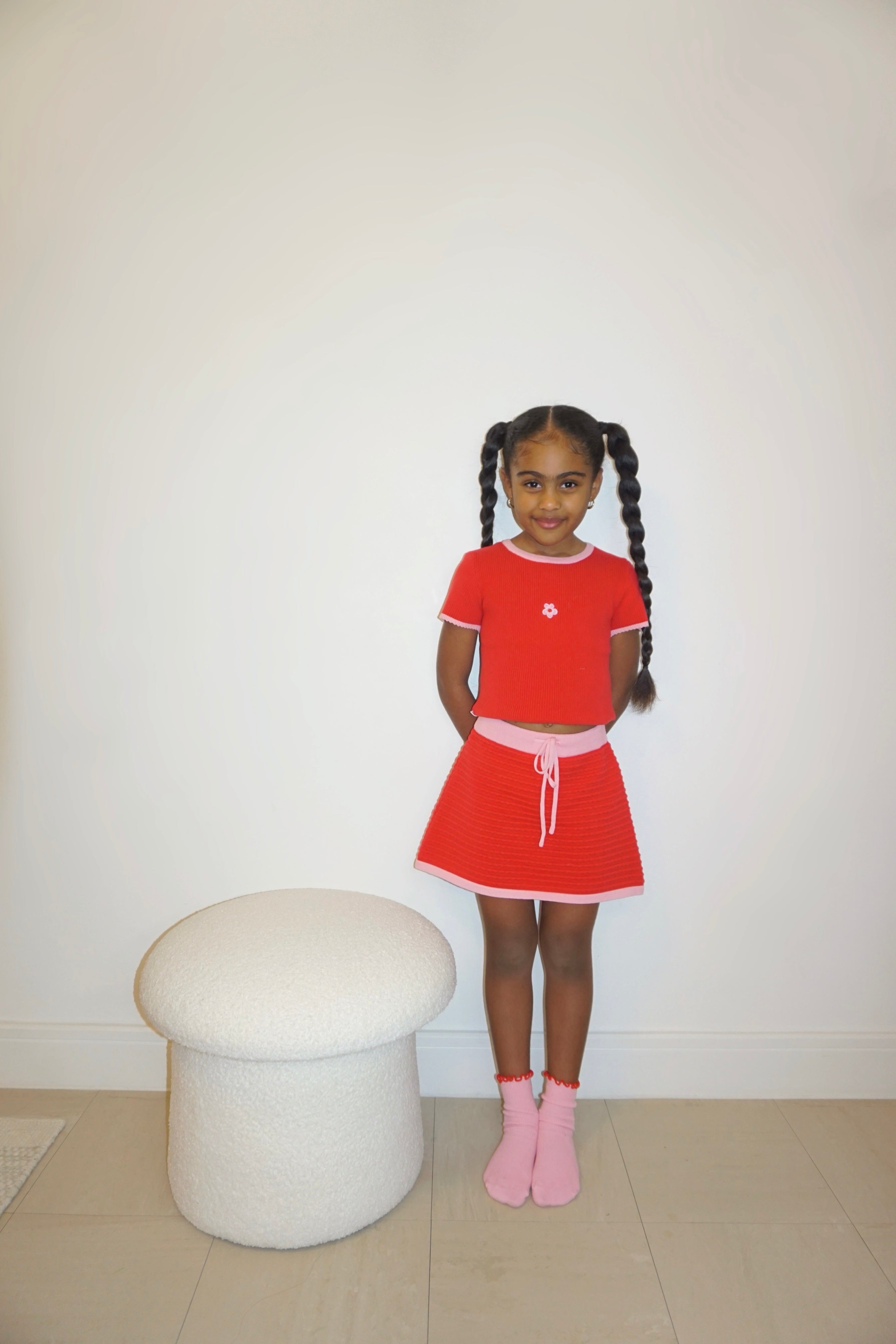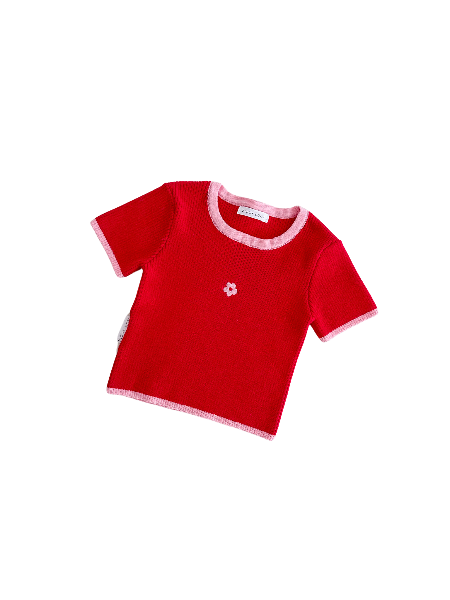 Elodie ribbed short sleeve tee with mini scallop hem detail, featuring Maeve coloured binding and embroidered flower on front. Mix and match with our Elodie, Margot, Rosa + Maeve Collections.