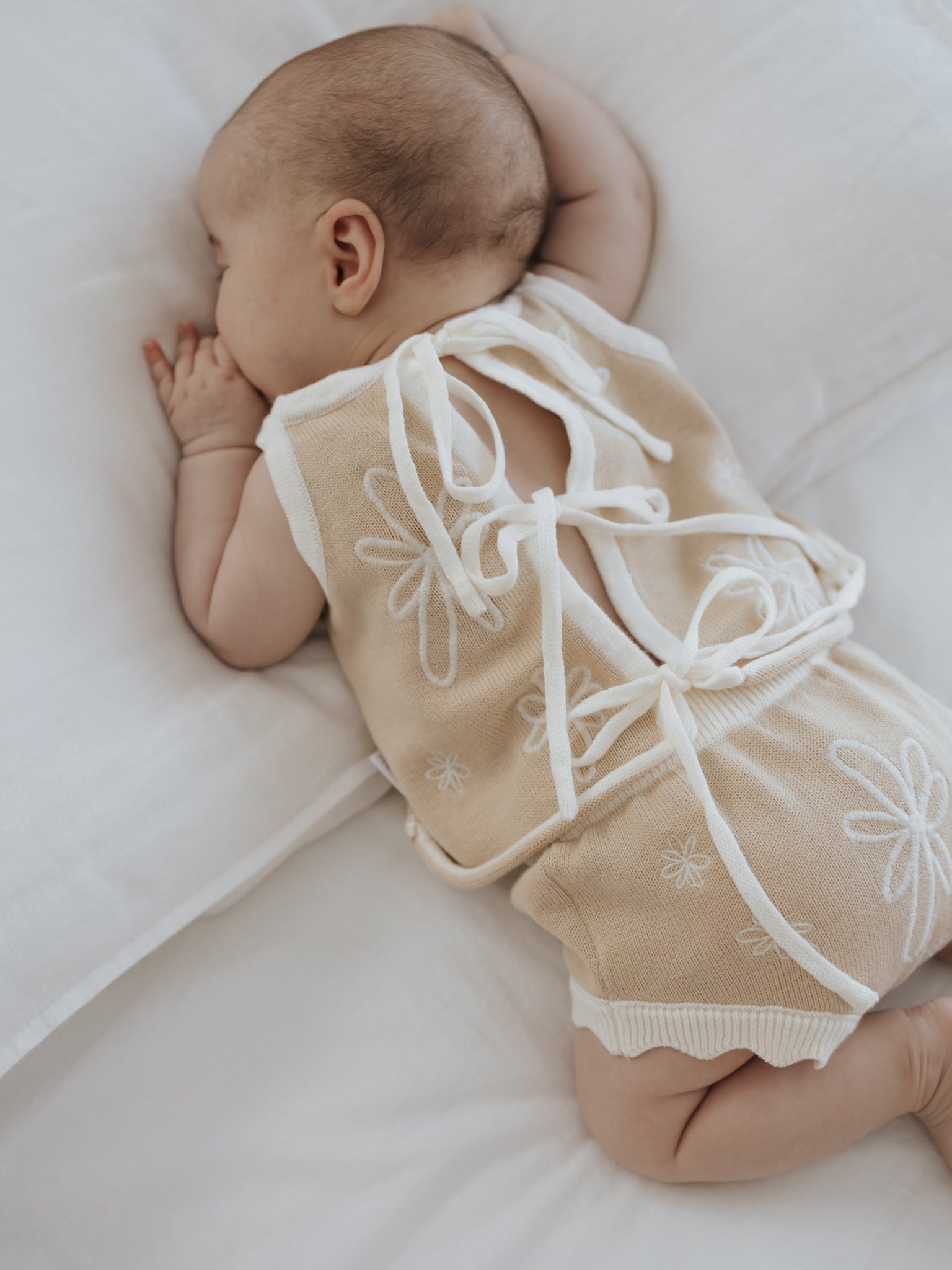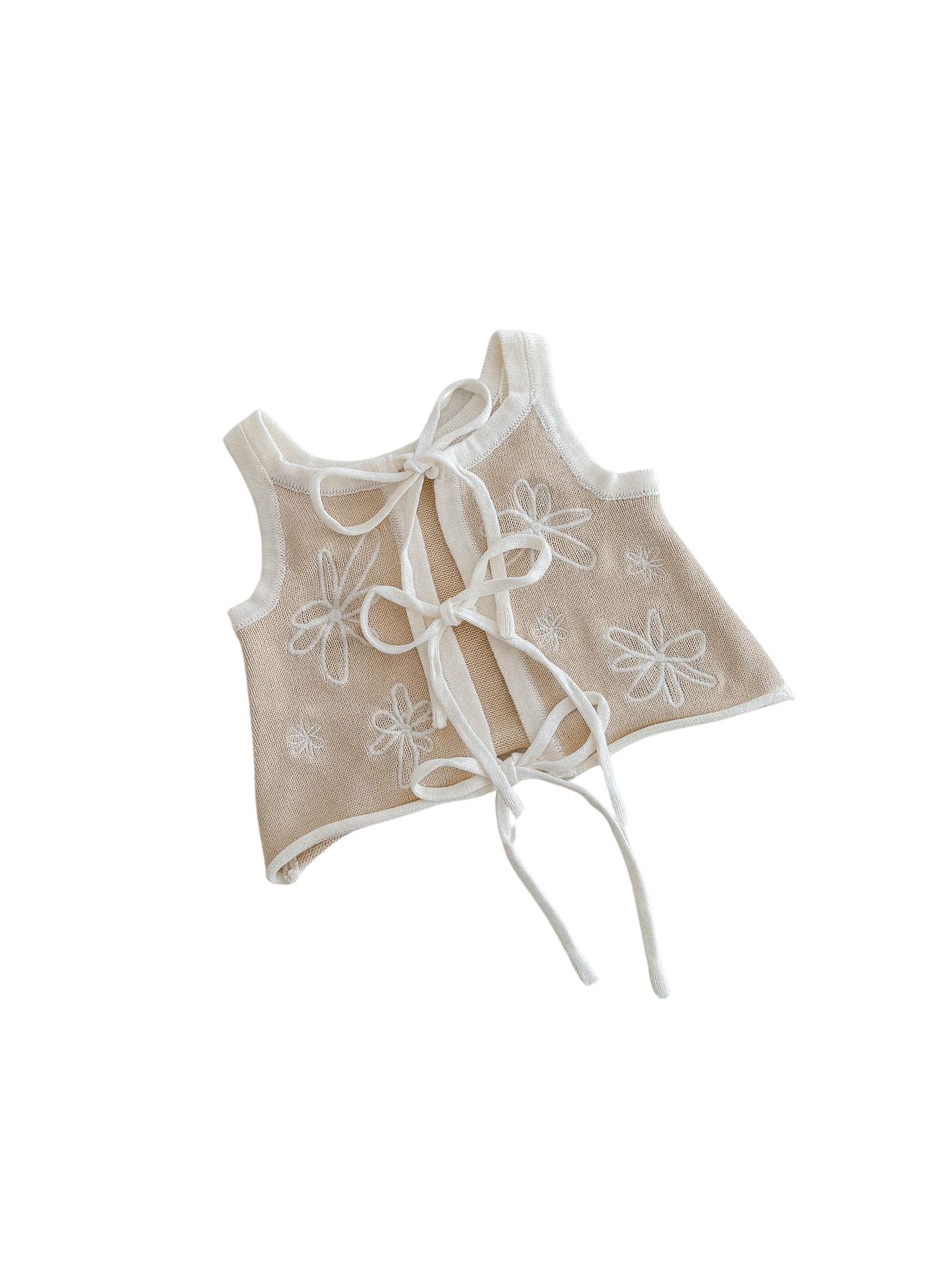 Knitted singlet in our Latte colour featuring our embroidered Gia design in Milk.