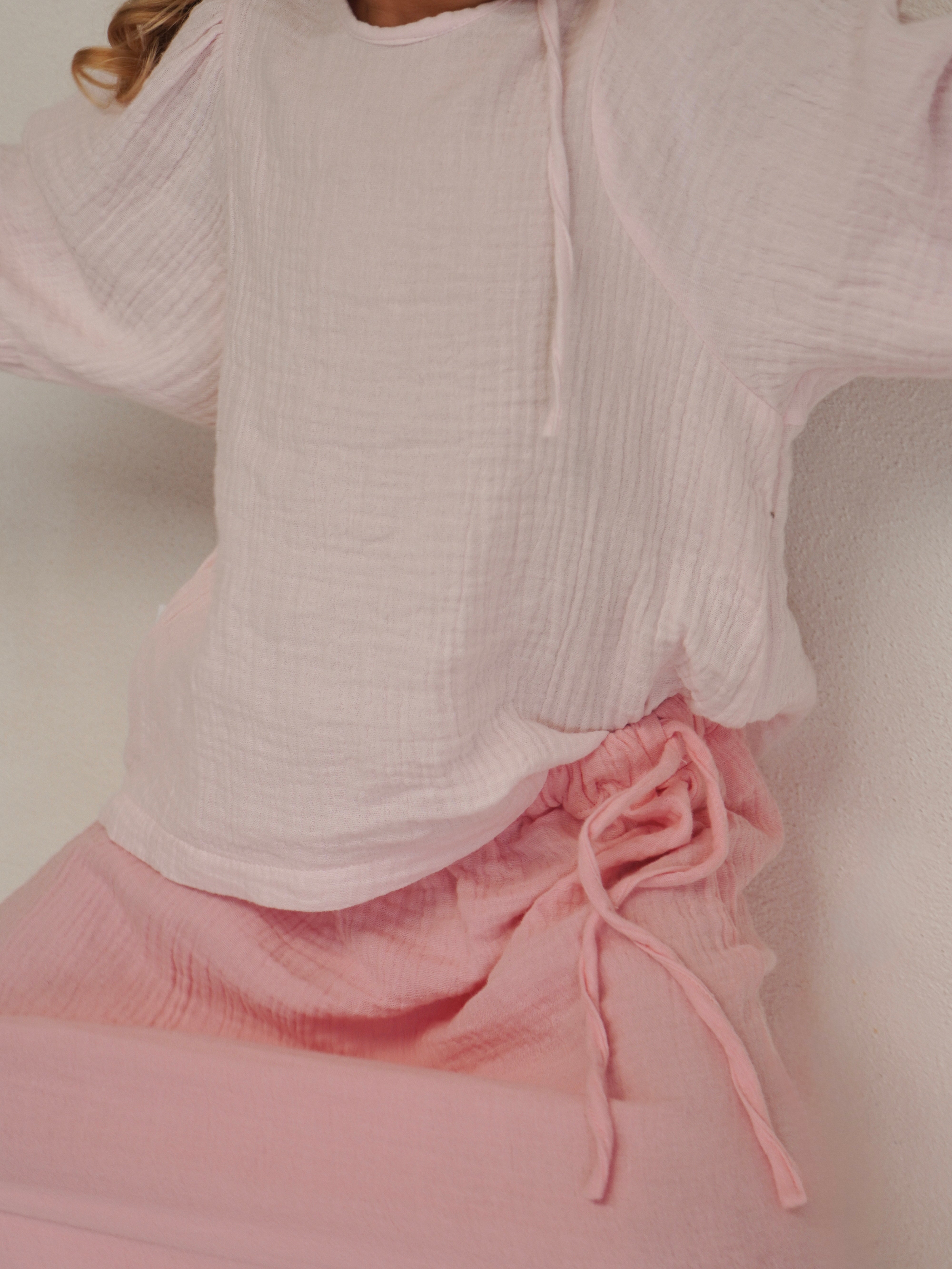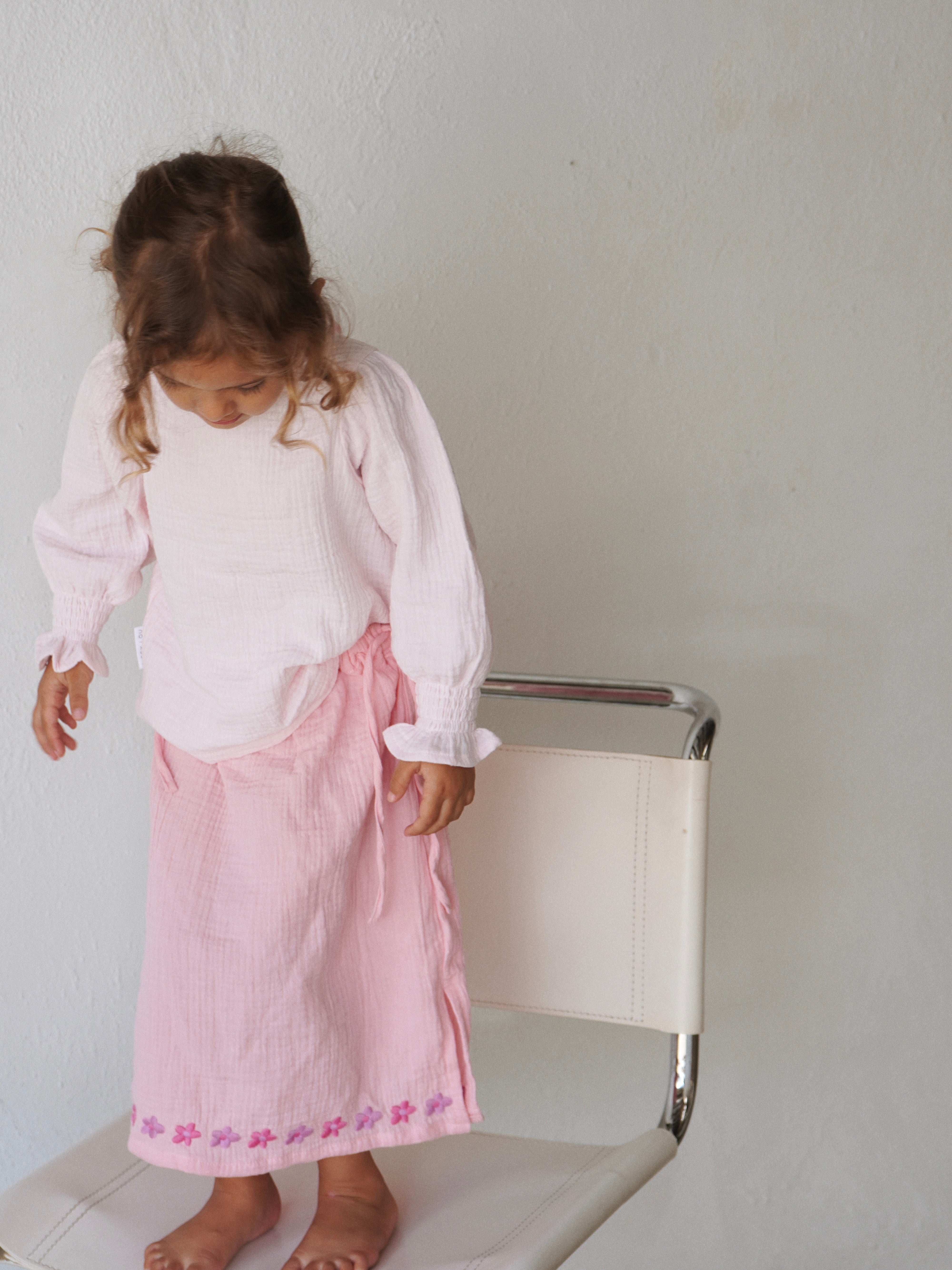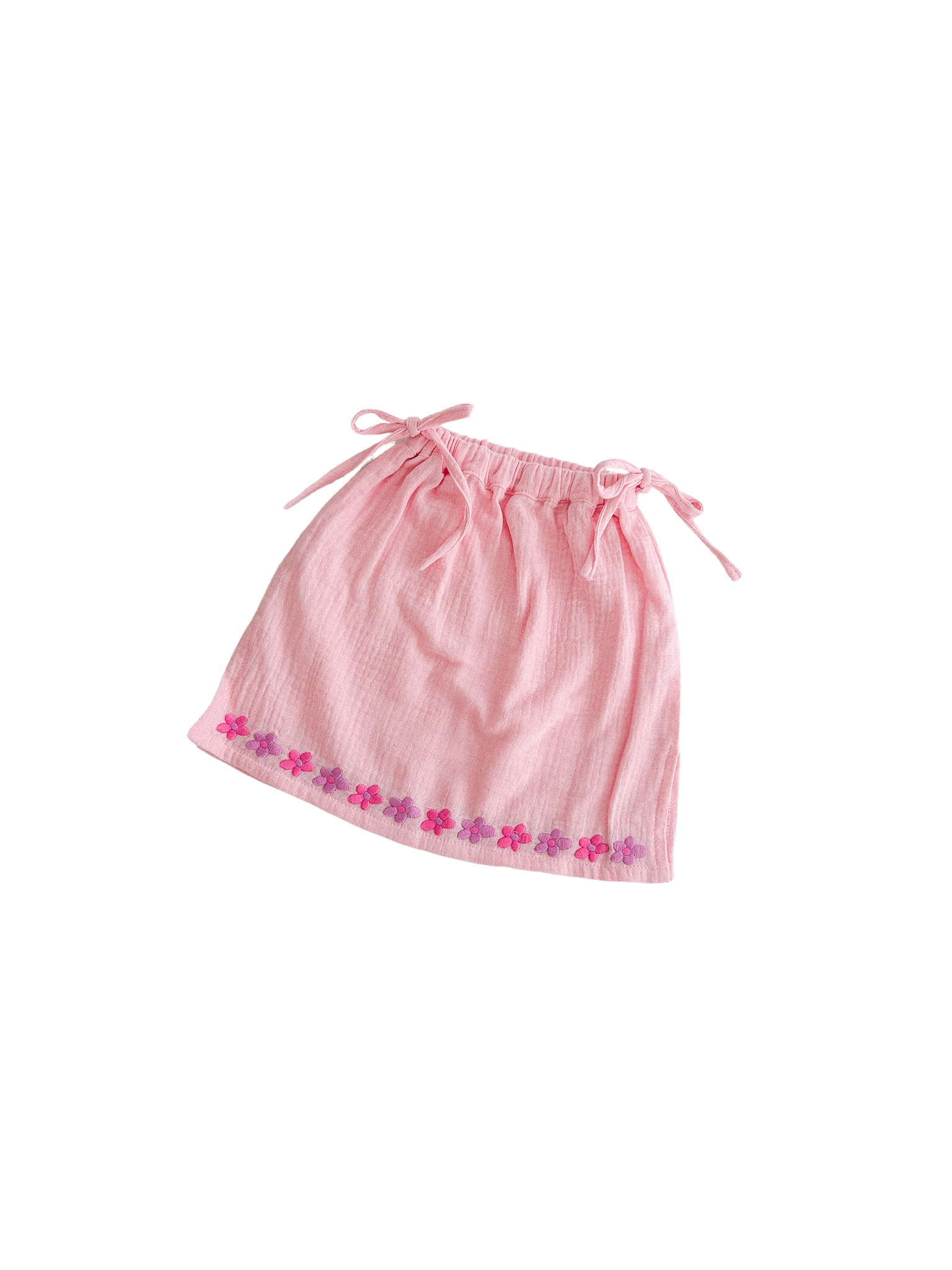 Lightweight, long cotton skirt with adjustable ties on each side of the waist to create the perfect fit and our Cora floral design embroidered along the bottom hem of skirt. Mix and match with items from our Cora, Grace + Lila Collections.