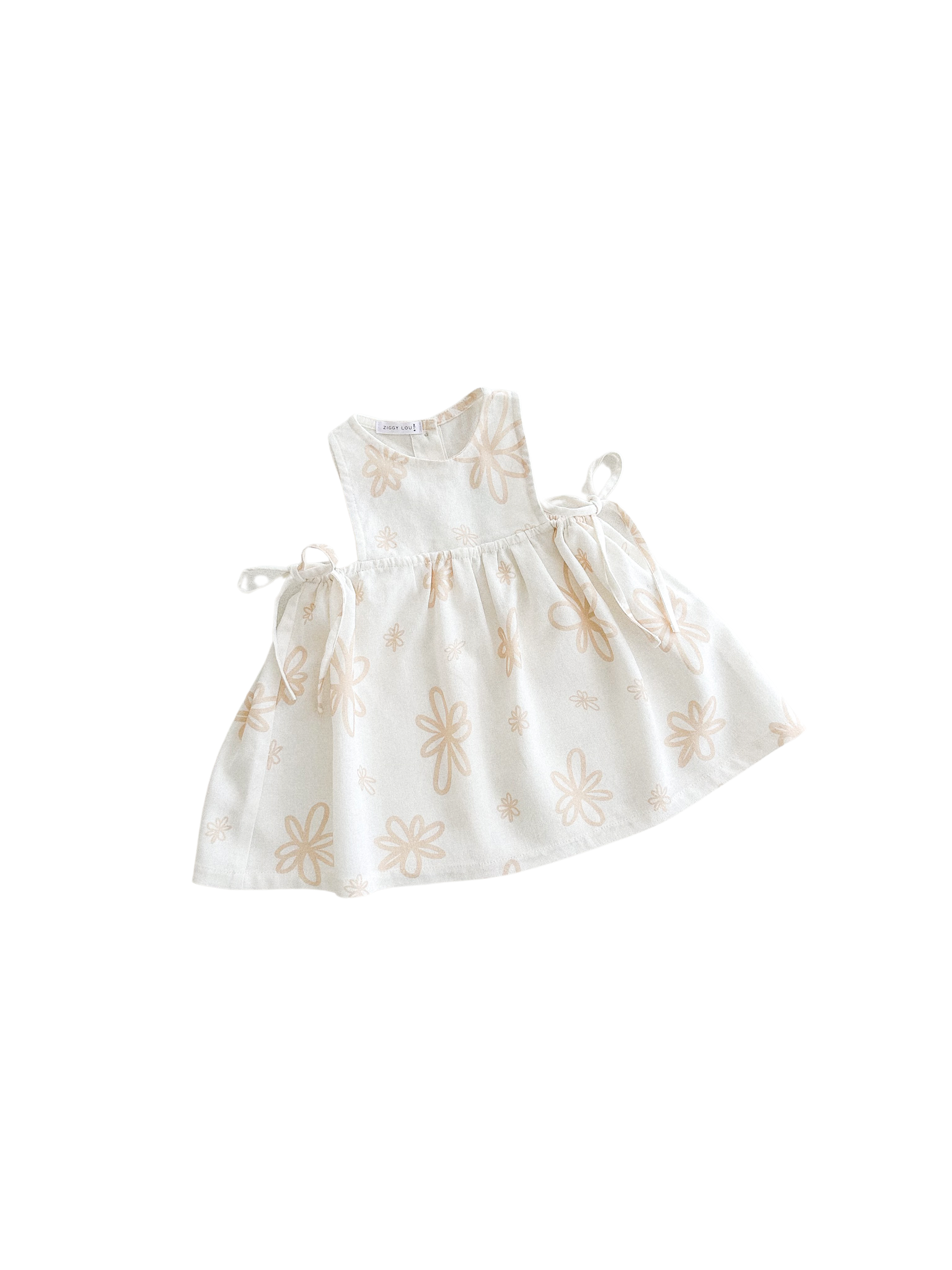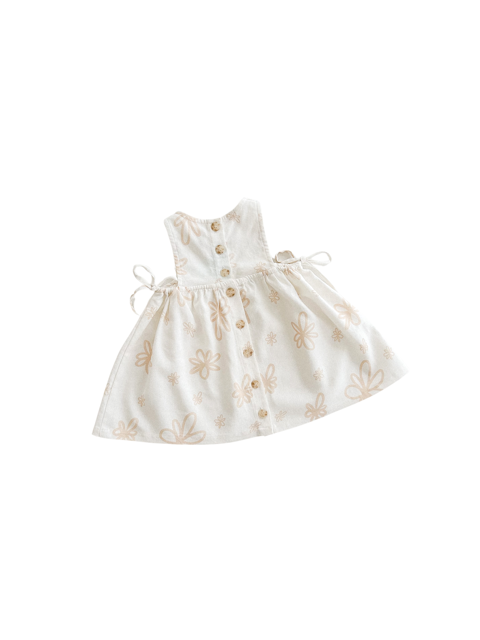 Linen blend dress featuring Gia printed design. Adjustable ties at waist and buttons on the back for easy on/off.