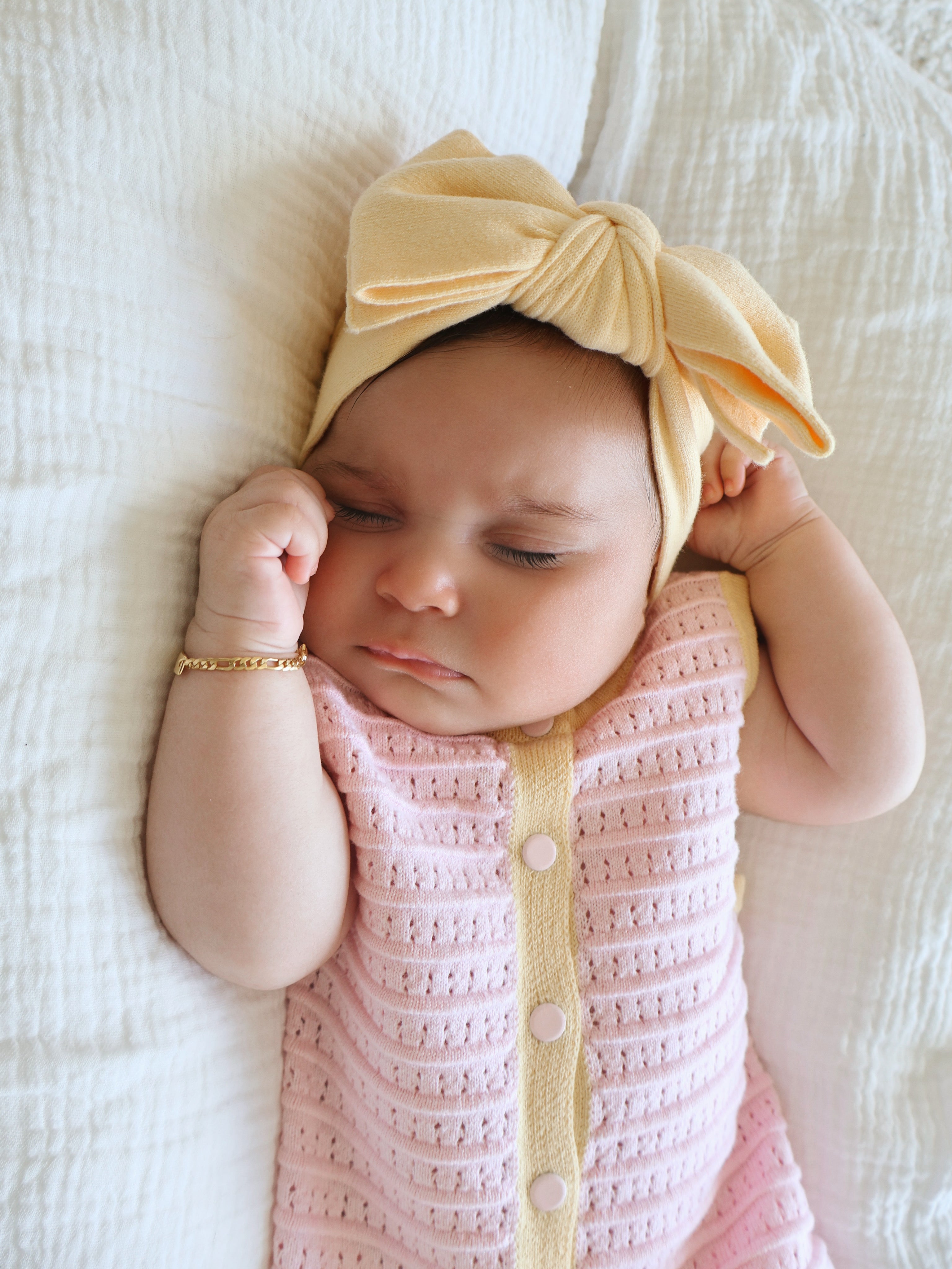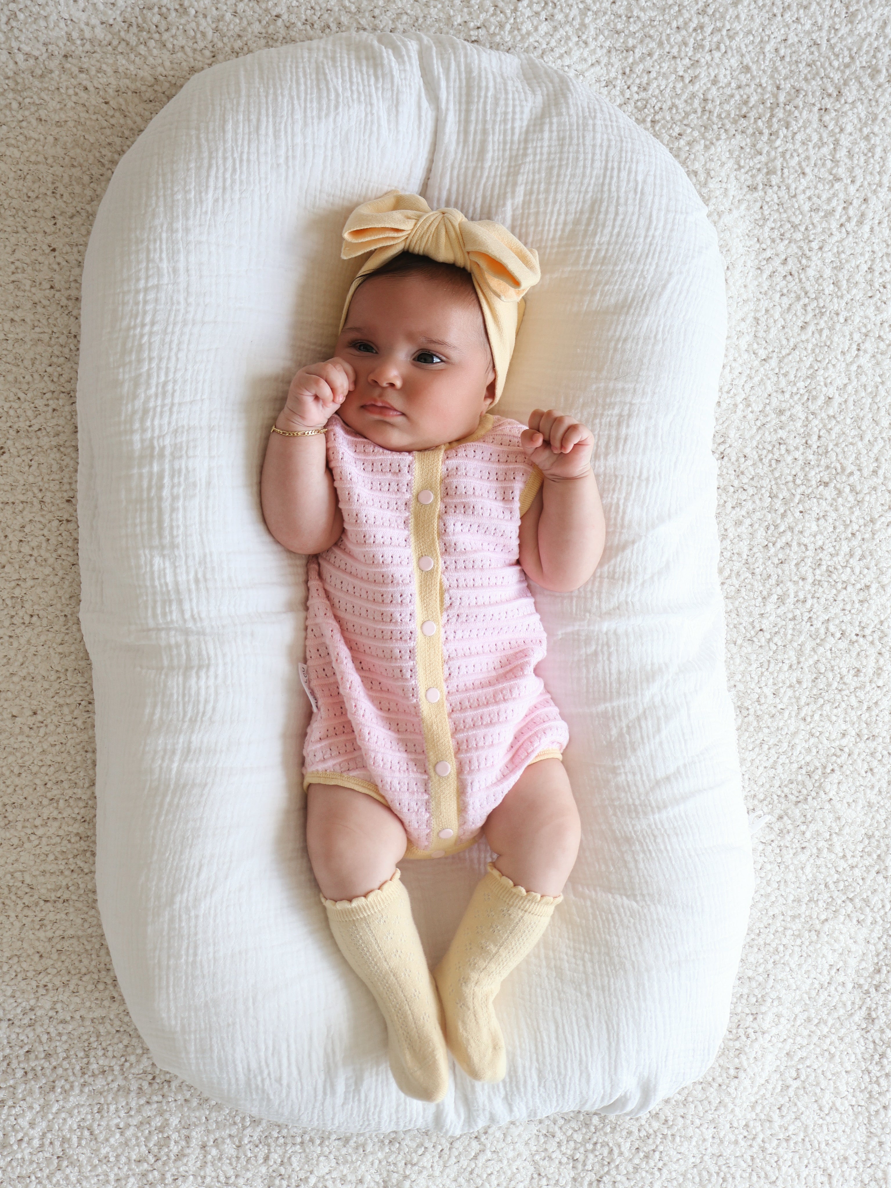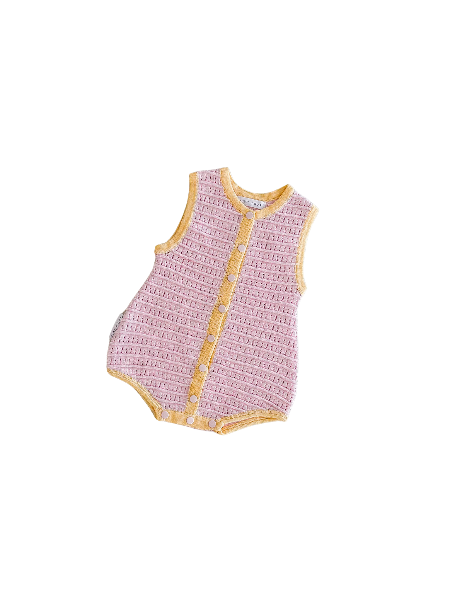 An eyelet knit bubble romper in our Freya + Butter colours. Functional snap buttons down the front and on the crotch for easy on/off and nappy changes.