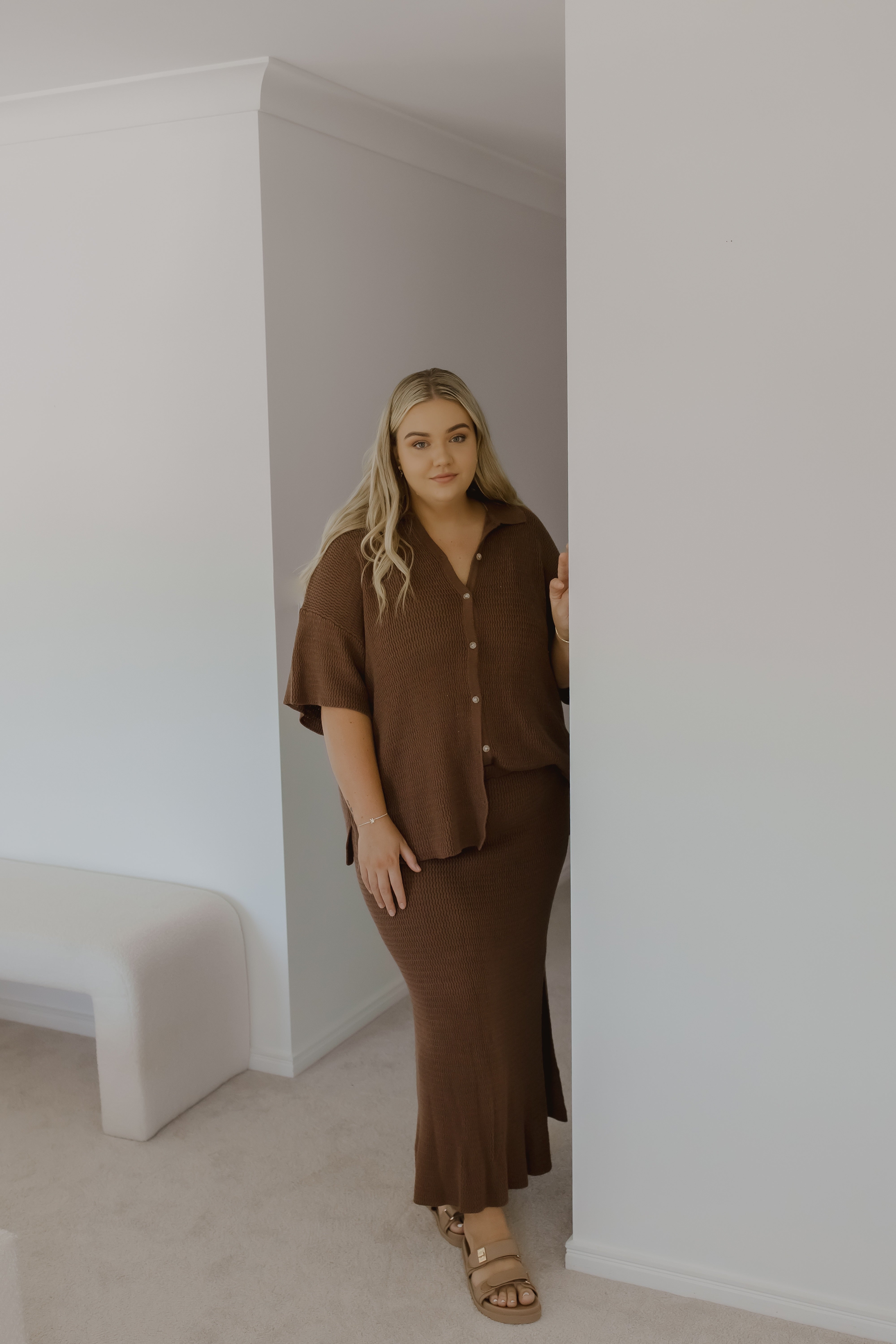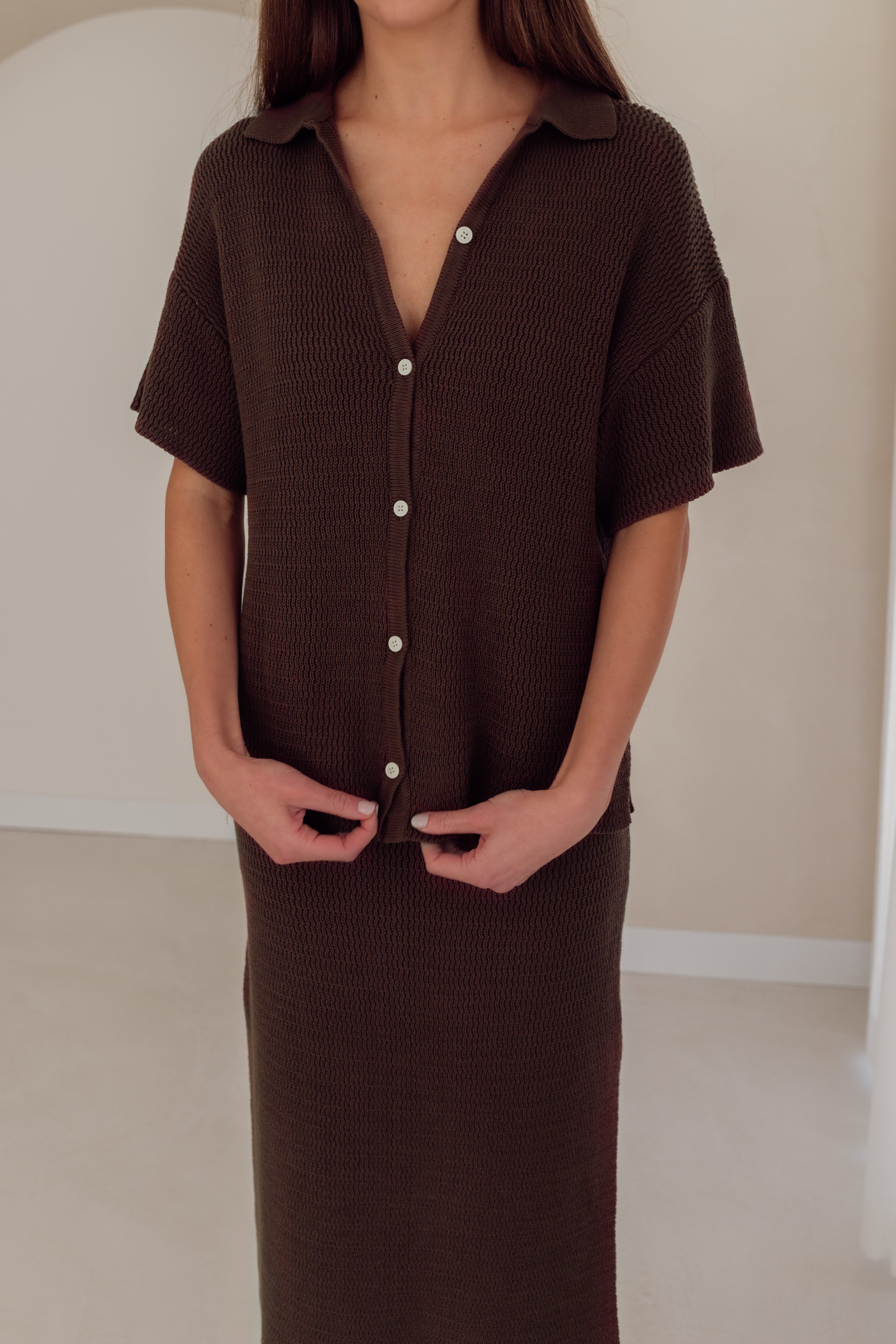 Relaxed button up, short sleeve shirt in a loose knit style. Pair with our Chocolate knit skirt or shorts for the perfect outfit.