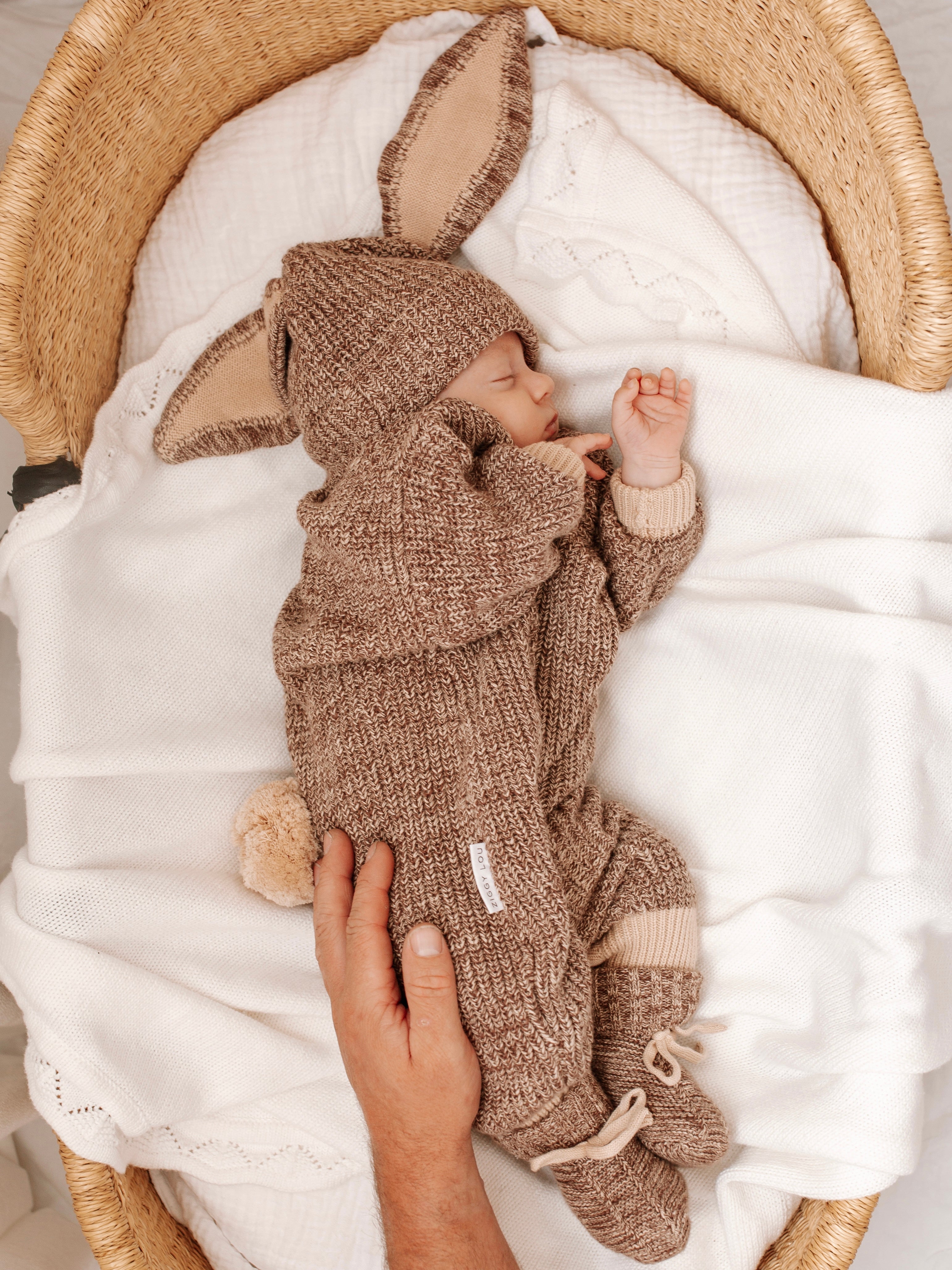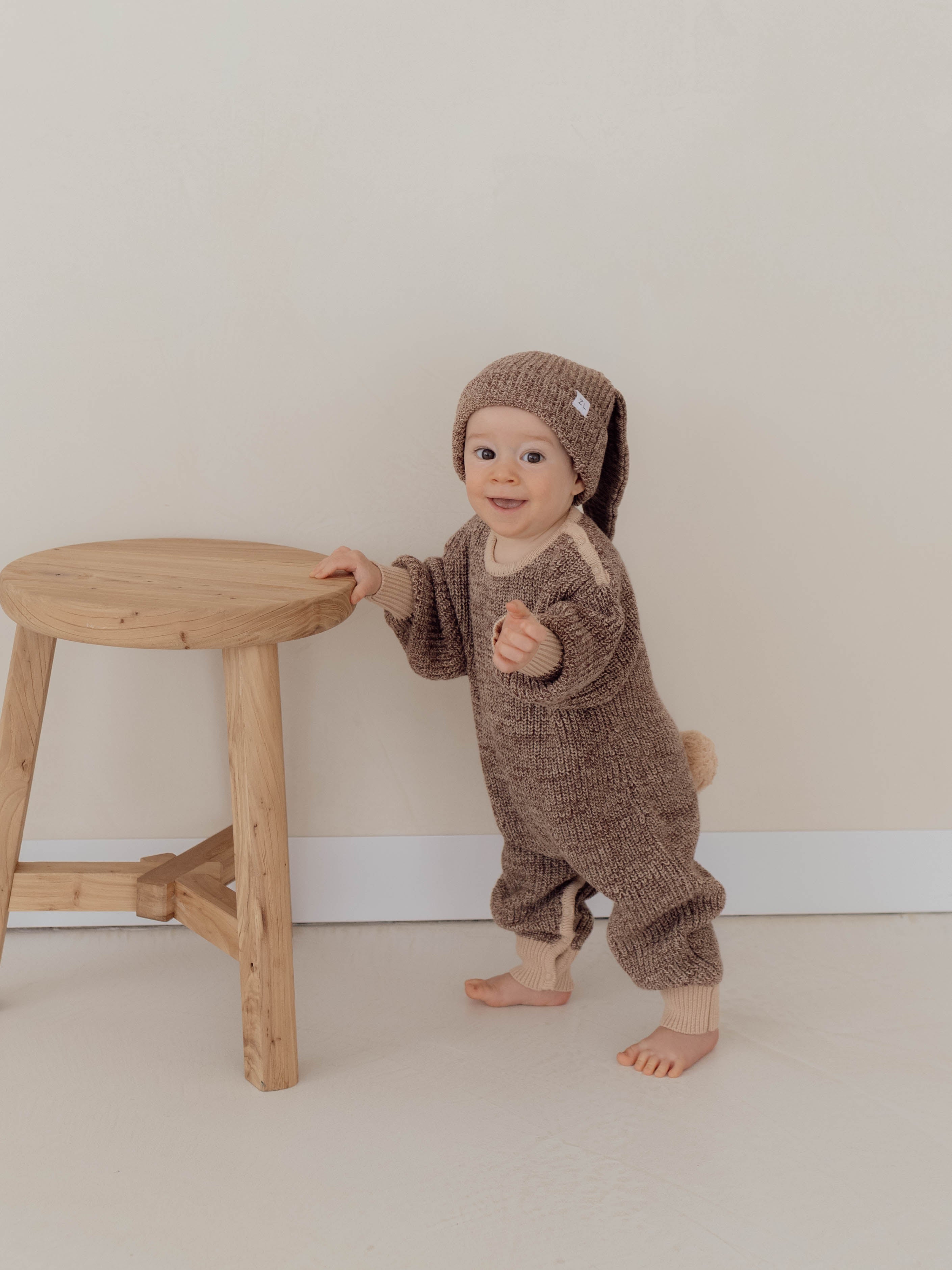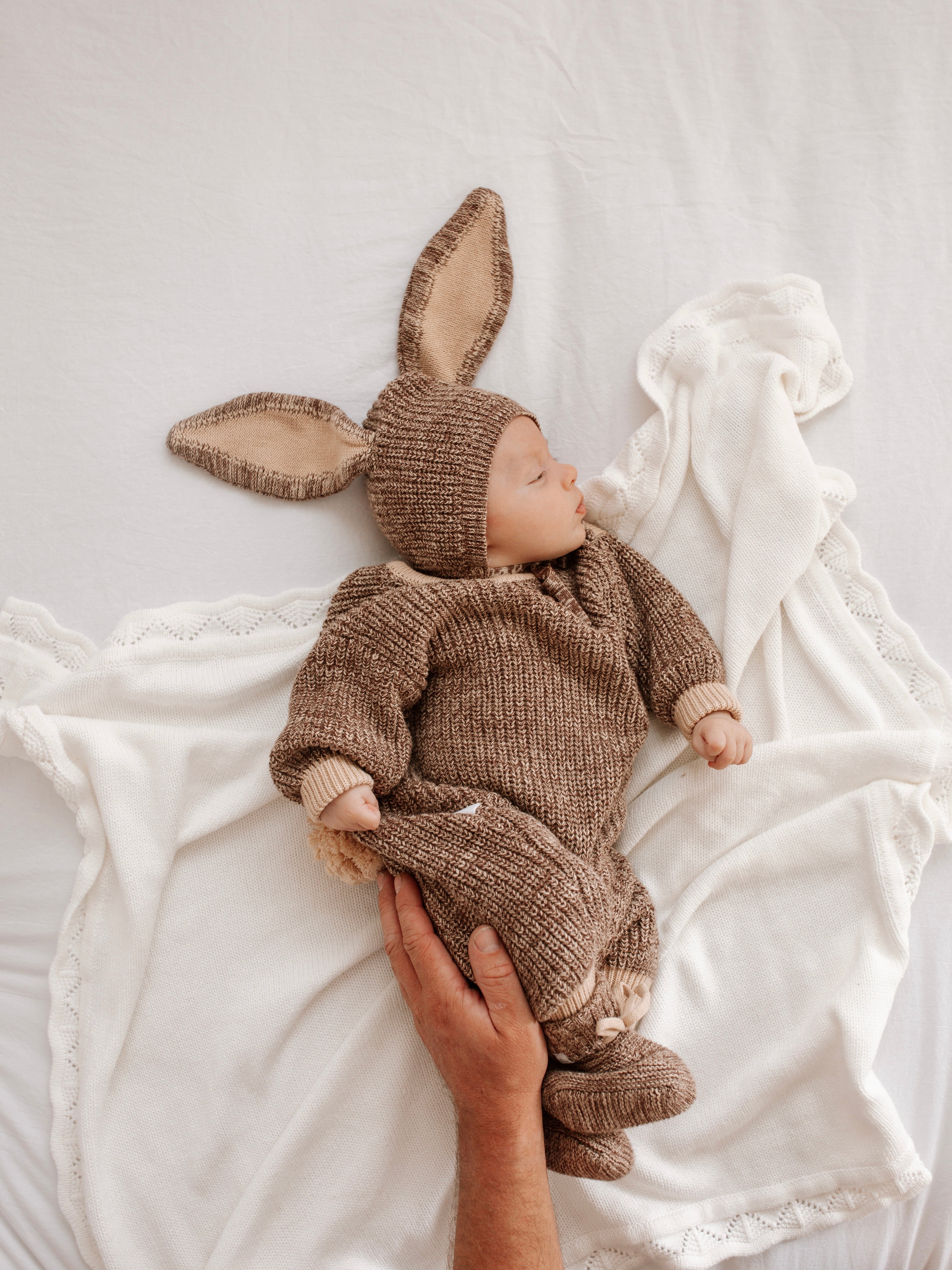 Our Easter winter playsuit in our two tone Cedar colour features an adorable and removable bunny tail (press snap). Functional snaps at crotch for easy nappy changes, and snaps at shoulder for easy on/off. Matching Cedar Easter Beanie and Booties also available.